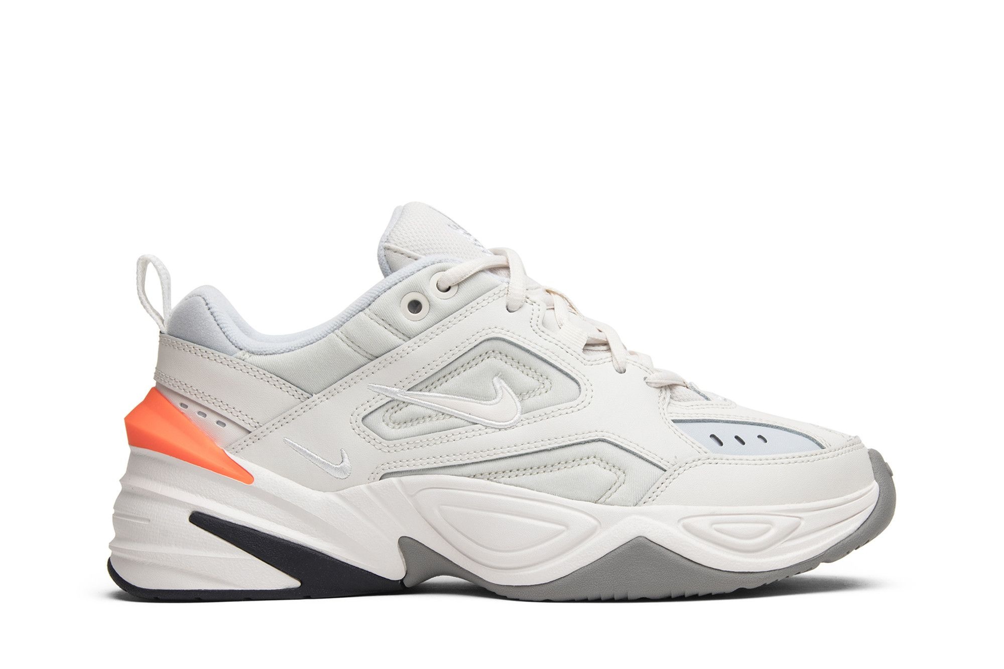 Nike’s M2K Tekno shoe first debuted on the runway at a John Elliott show. The shoe itself is a reworked rendition of the Air Monarch, featuring the signature chunky aesthetic with a combination of white leather paneling on the upper. Pure Platinum and orange accents hit up the outsole and heel.