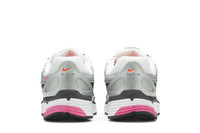 The Nike Wmns P-6000 flashes back to the 2006 Pegasus model with an overbuilt design and techy ingredients. This 'Laser Fuchsia' women's variant—revealed in May 2019—brings the 2000s into focus with a two-tone mesh inner bootie overlaid by metallic leather detailing. Bright branding pops against the muted backdrop. Dual Air units within the channeled midsole and a multicolored rubber outsole continue the retro theme.