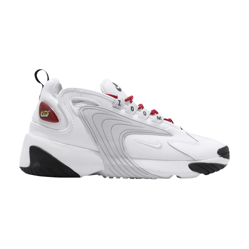 Revealed in October 2019, the Nike Wmns Zoom 2k from the 'Icon Clash' collection characterizes the spirit of retro basketball gear. The women's sneaker brings together white mesh, neoprene and sculpted leather with rubber wings and logo-lettered eyestays. Gym Red colors the laces and branded heel pod for a throwback feel. A Zoom Air midsole with an exaggerated heel and rubber wing wrapping the outsole lend a past-meets-future aesthetic. UPPER MATERIAL Textile