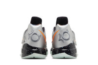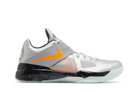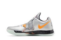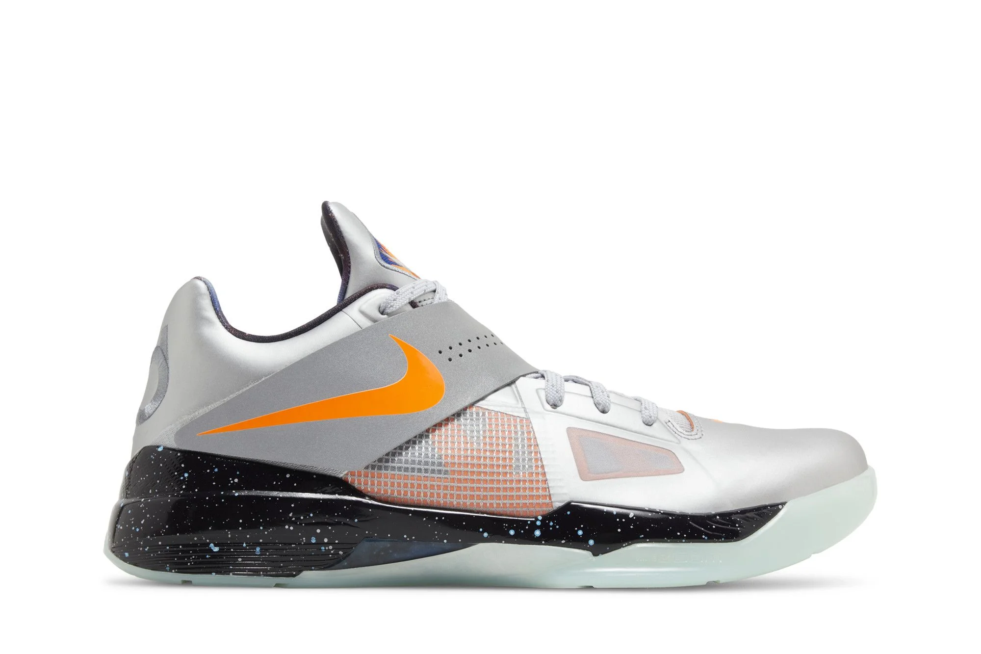 The 2024 edition of the Nike Zoom KD 4 'Galaxy' brings back one of the key releases from Nike's 2012 NBA All-Star Collection. Adorned with a large orange Swoosh, an Adaptive Fit Strap secures the silver mesh upper, fortified with fused synthetic overlays in a matching metallic silver finish. Reflecting the shoe's cosmic theme, a starry graphic enlivens the black Phylon midsole, featuring springy Zoom Air cushioning in the forefoot. The low-top is underpinned by a glow-in-the-dark rubber outsole. UPPER MATERIAL Synthetic