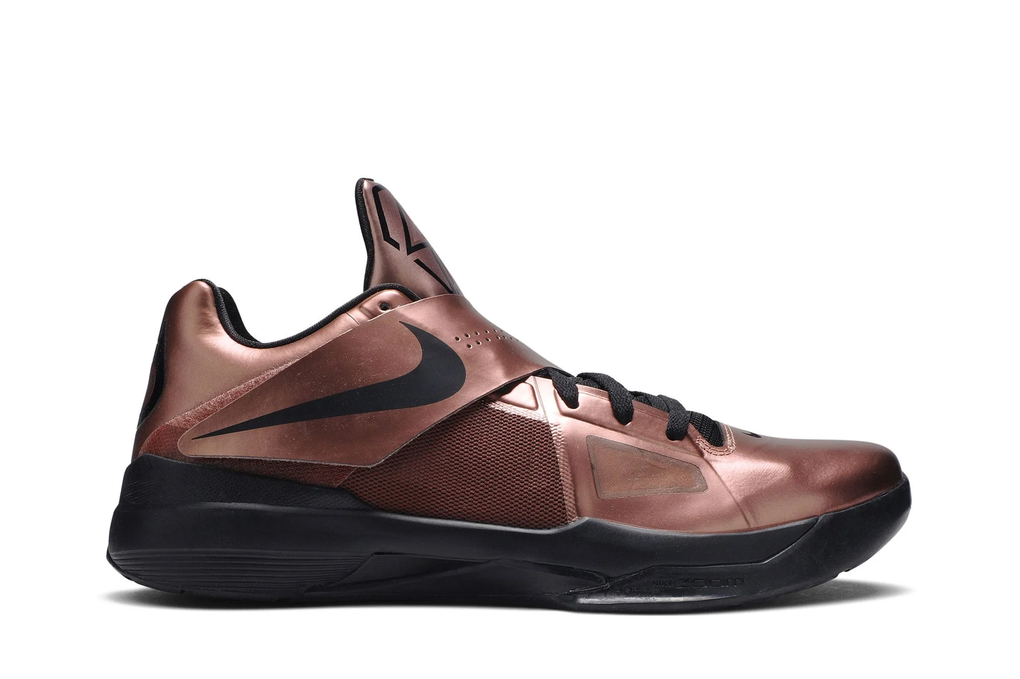 Kevin Durant’s fourth signature shoe features an Adaptive Fit System with a three-layer Hyperfuse construction, midfoot strap, Phylon midsole, and Forefoot Zoom Air cushioning. This Christmas edition of the KD 4 was laced up by Kevin Durant for a Christmas Day game against the Orlando Magic in 2011. It features a Metallic Bronze upper with black accents, perforated detailing on the strap, an extra set of red laces, and Christmas cookie KD branding in the insole.