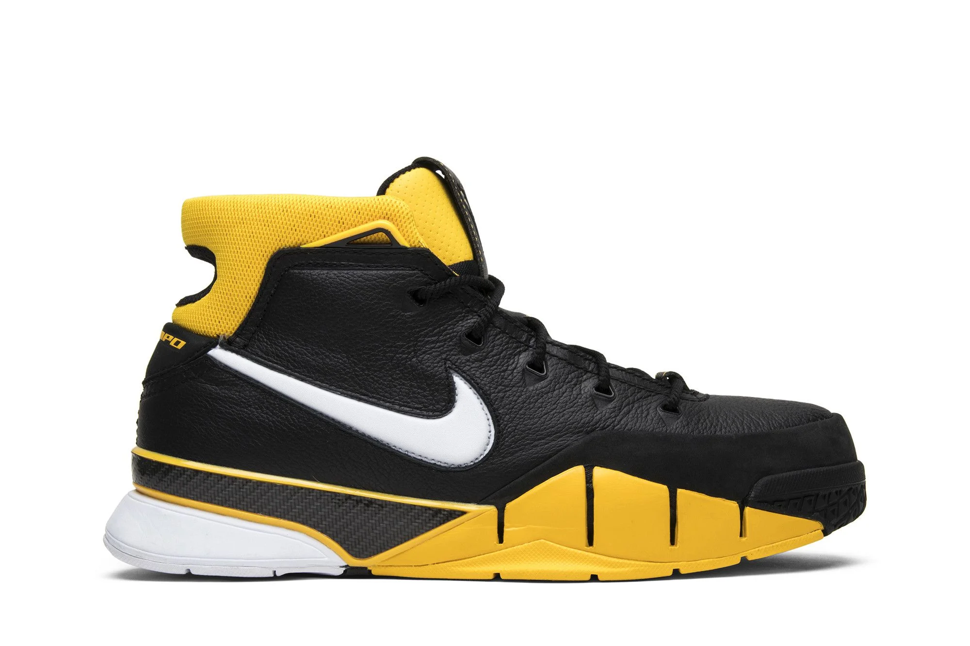 Not all updates require aesthetic or design changes. Sometimes, improving the technology that goes into the shoe is precisely what that model needs to reboot itself. The Zoom Kobe 1 Protro 'Black Maize' 2018 plays on the retro look of the 2006 Kobe 1 but adds a modern feel by creating the lightest version of the model yet with improved cushioning and a smaller carbon fiber shank. The sneaker boasts a black leather upper with a Varsity Maize knit collar, large white Swoosh branding, and a full-length Zoom midsole.