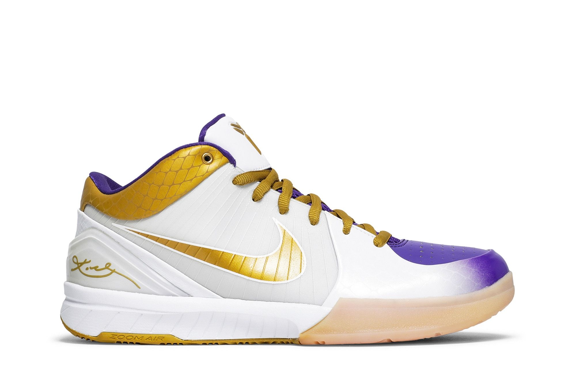 Kobe Bryant wore the Nike Kobe 4 ‘MLK’ during a Los Angeles Lakers game held on Martin Luther King Jr. Day in 2009. Bryant’s first low-top silhouette, the shoe features a white synthetic base with supporting Flywire cables and a gradient Varsity Purple finish on the toe. Contrasting pops of metallic gold appear on the Swoosh and collar, with the latter treated to a subtle snakeskin texture.