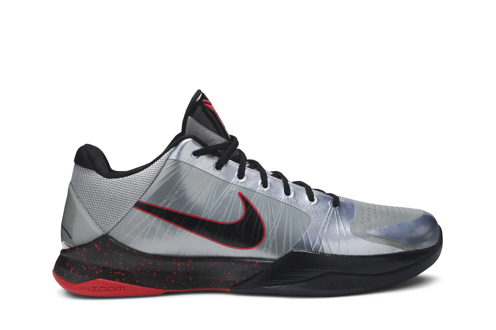 The Nike Zoom Kobe 5 'Wolf Grey' provides a low-top silhouette with a colorway of Wolf Grey, black and Daring Red. Released in 2010 and designed by Eric Avar, this shoe is lighter and lower than earlier Kobe signatures, a change inspired by what the Los Angeles Lakers great saw soccer players wearing. It features Kobe's 'Sheath' branding on its tongue, a mostly grey upper and Bryant's signature on the heel. A black, Phylon-injected midsole with red speckles on the back half and Nike Zoom units in the heel and forefoot round out the look.