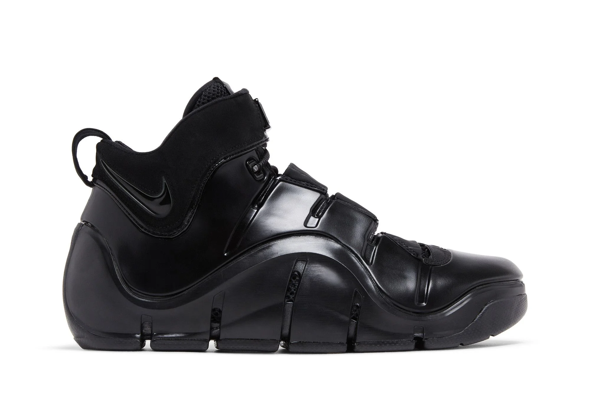 The 2023 edition of the Nike Zoom LeBron 4 ‘Black Anthracite’ brings back a monochrome colorway of LeBron James’ fourth signature shoe. A sleek one-note finish is executed on the molded Foamposite upper, secured with traditional lace closure and an adjustable ankle strap. Lightweight cushioning is provided by a drop-in polyurethane midsole that packs a full-length Zoom Air unit for on-court responsiveness. Underfoot, the herringbone traction rubber outsole features deep flex grooves for a natural stride. UPPER MATERIAL Foamposite