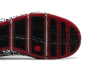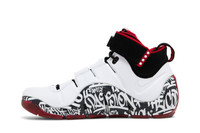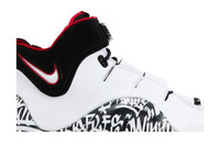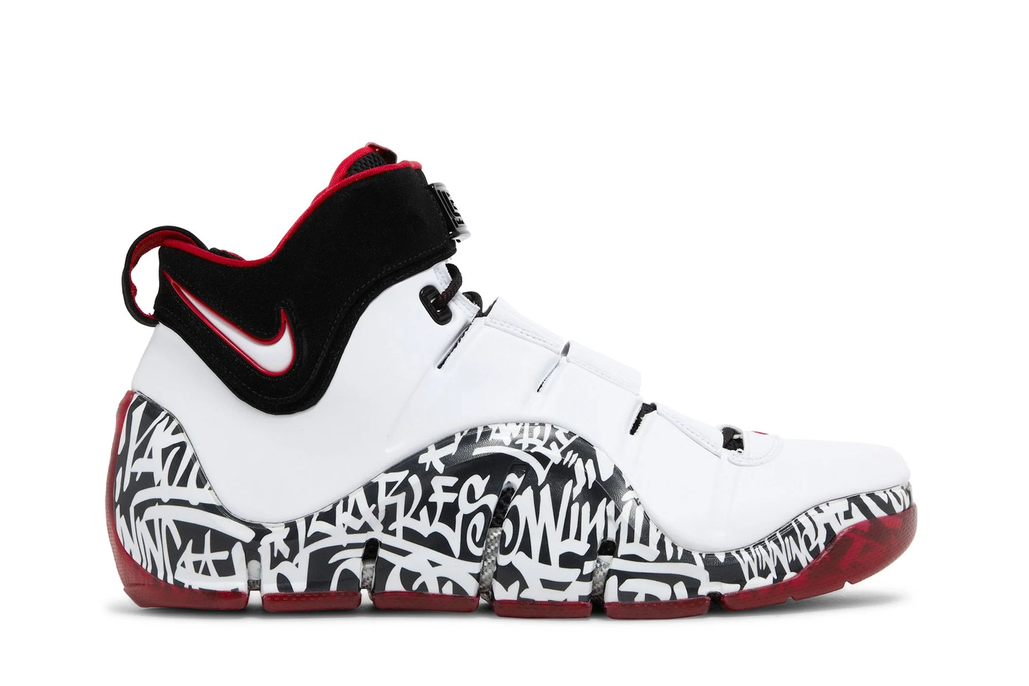 The 2023 edition of the Nike Zoom LeBron 4 ‘Graffiti’ brings back a rare colorway of LeBron James’ fourth signature shoe. Originally limited to 250 pairs and released in 2006 via a pop-up activation in New York City, the retro silhouette makes use of a white Foamposite upper, contrasted by white-on-black graffiti-inspired graphics throughout the wavy Phylon wrap. The mid-top is secured with hidden lace closure and an adjustable black nubuck strap that wraps around the ankle. Lightweight cushioning is provided by a polyurethane insole, fitted with a full-length Zoom Air unit for on-court responsiveness. Underfoot, the translucent red rubber outsole features segmented construction for a smooth, natural stride. UPPER MATERIAL Foamposite