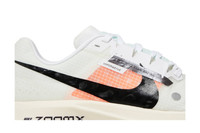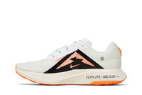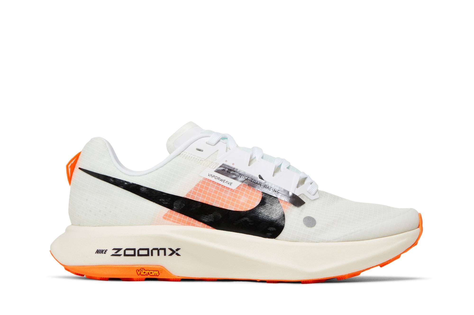 The Nike ZoomX Ultrafly Trail ‘Prototype’ makes use of a white Vaporweave mesh upper, accented with a cropped black Swoosh on the lateral side. Reflective detailing at the forefoot and heel provides enhanced visibility in low-light conditions. A feeling of forward propulsion is enabled by a carbon Flyplate, embedded between a layer of ZoomX foam and a fabric-wrapped midsole. Underfoot, a Vibram rubber outsole in Total Orange features a chevron lug pattern designed to grip the trail in wet or dry conditions. UPPER MATERIAL Vaporweave