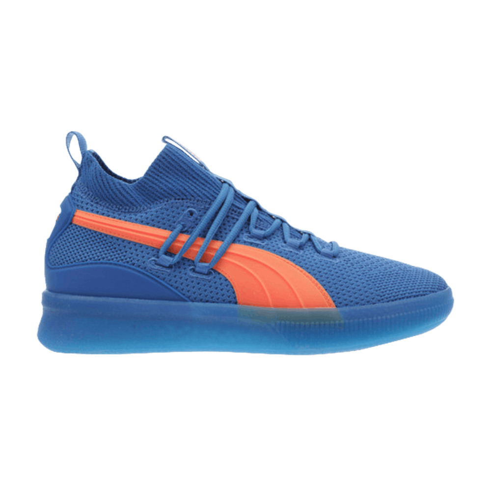 Puma’s Clyde Court model is inspired by basketball icon Walt Clyde Frazier. In June 2019, a five-sneaker collection was released to celebrate the NBA draft. The Puma Clyde Court 'City Pack - New York’ showcases a Strong Blue and Shocking Orange colorway in honor of the New York Knicks. The fully knitted upper features a slip-on bootie structure with a heel cage for support. Below, PUMA IGNITE foam and NRGY beads unite for premium comfort.
