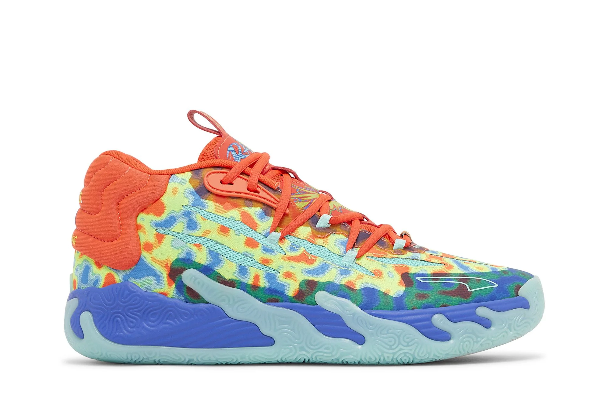 The PUMA MB.03 ‘GutterMelo’ debuts LaMelo Ball’s third signature shoe in a limited-edition colorway designed in collaboration with the Gutter Cat Gang, the self-described ‘underground web3 social club.’ The upper combines engineered mesh in a bright teal finish with multicolor synthetic overlays in blue, green and scarlet. The latter hue is repeated on the collar, laces and tongue, featuring a Gutter Cat graphic with LaMelo’s ‘Rare’ branding. Anchoring the sneaker is a NITRO Infused foam midsole, supported underfoot by a non-slip, high-abrasion rubber outsole. UPPER MATERIAL Synthetic