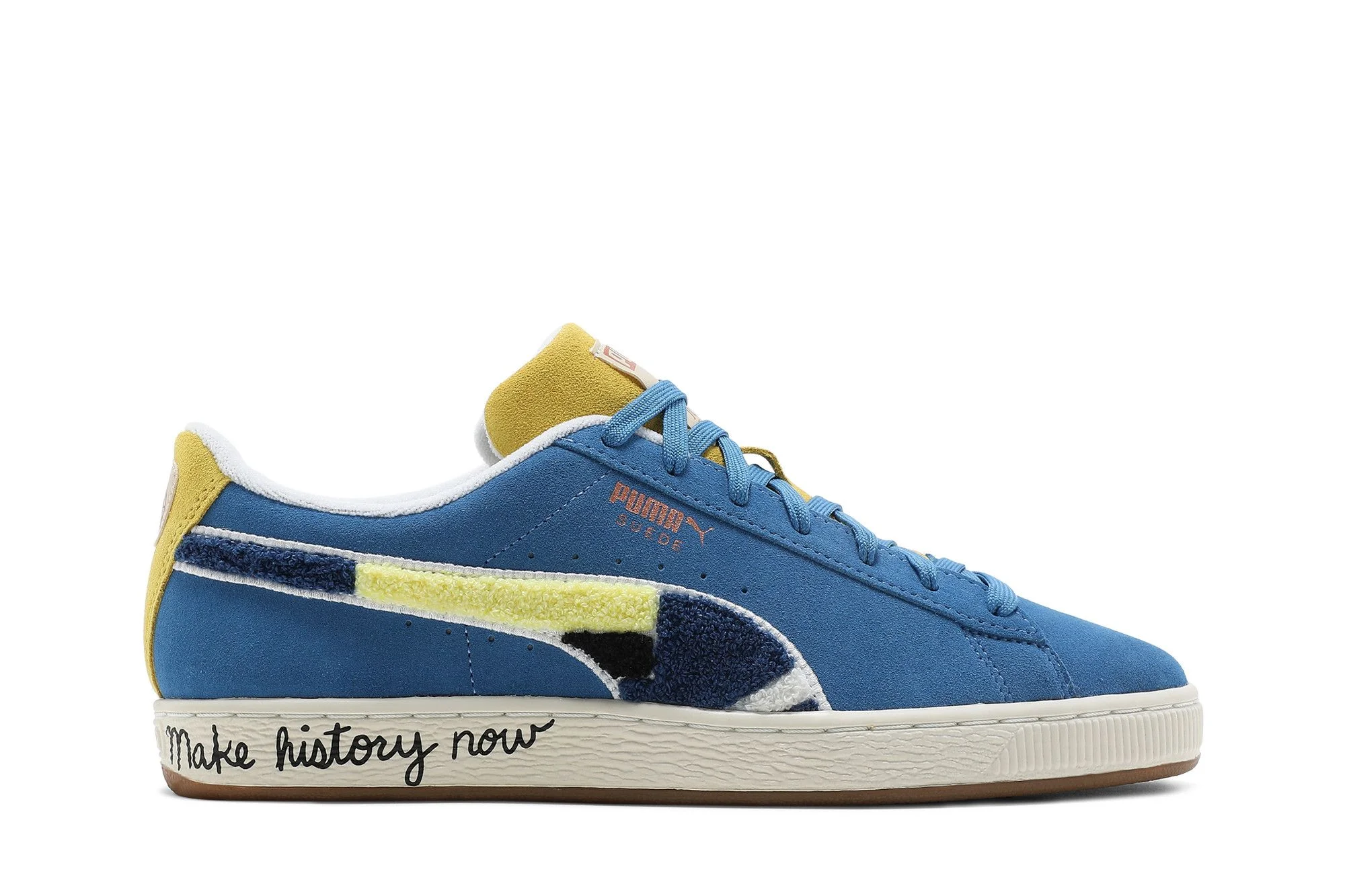 The PUMA Suede Classic ‘Star Sapphire’ is designed in collaboration with the Black Fives Foundation, a nonprofit dedicated to preserving and teaching the pre-NBA history of African Americans in basketball. The low-top makes use of a blue suede upper with a color-blocked chenille Formstrip in yellow, black and navy. Atop the yellow suede tongue, a stitched tag displays dual PUMA and Black Fives branding. ‘Make history now’ is scrawled on the off-white rubber midsole, reinforced underfoot by a gum rubber outsole. UPPER MATERIAL Suede