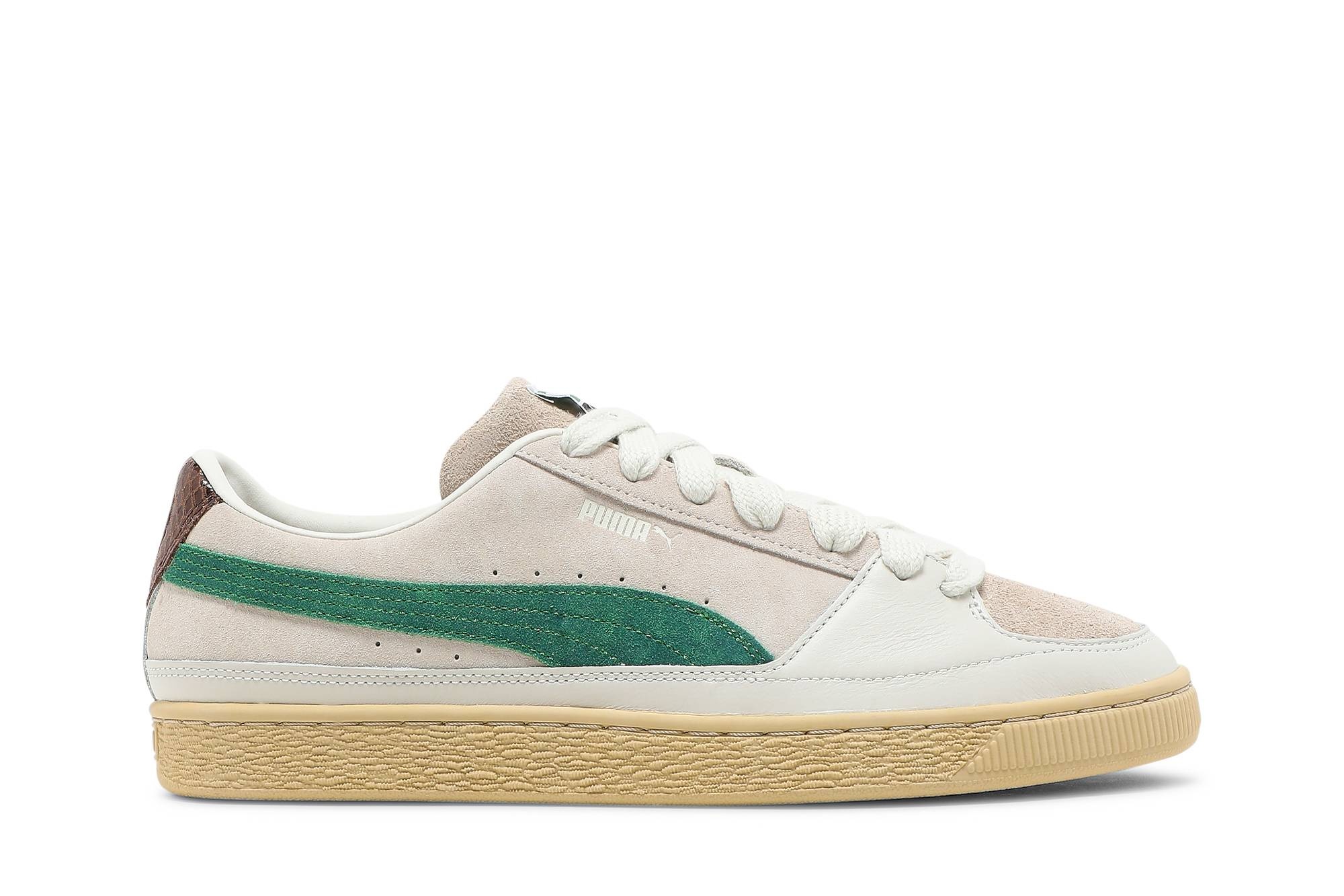 Crafted in collaboration with the Rhude founder and creative director, the Rhuigi x PUMA Suede ‘White Juniper’ draws inspiration from LA’s youth and skate culture. Extra-wide laces secure the tan suede upper, accented with an emerald suede Formstrip and faux snakeskin detailing on the heel tab. Rhugi Villaseñor’s signature is scrawled on the woven tongue tag and sockliner. The low-top sits on a yellow rubber cupsole, complete with a grid-like traction pattern underfoot. UPPER MATERIAL Suede