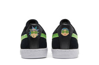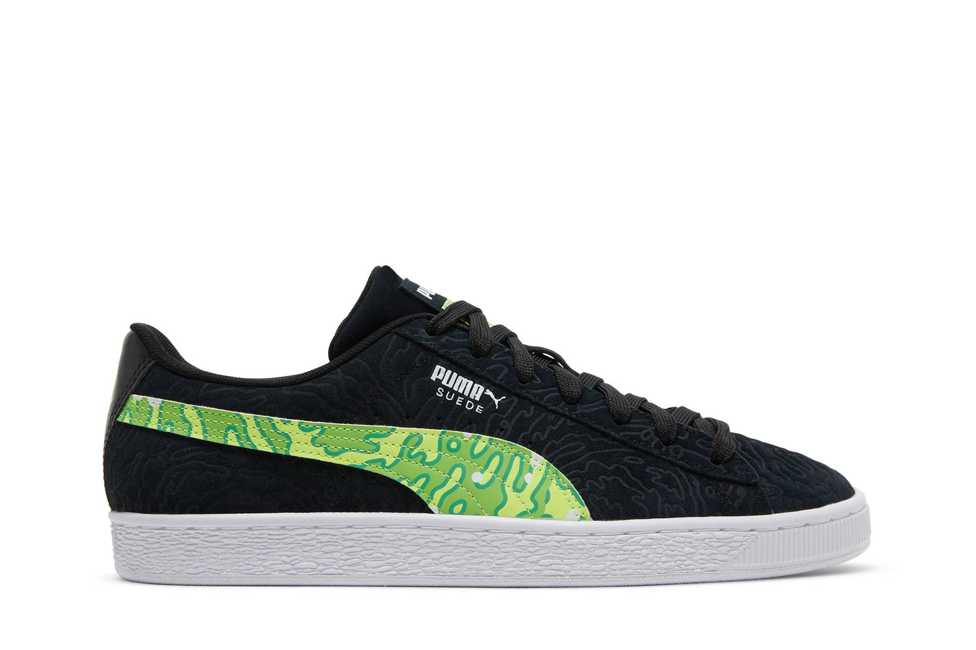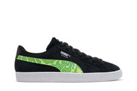 The Rick & Morty x PUMA Suede is taken from a capsule collection celebrating the animated Adult Swim series. The green leather Formstrip features a unique graphic print inspired by Rick and Morty’s interdimensional portal, with the swirling design repeated in tonal fashion on the black suede upper. Rick and Morty branding decorates the custom sockliner, while the likeness of each titular character is displayed on the left and right heel tab. A solid white rubber cupsole anchors the low-top. UPPER MATERIAL Suede