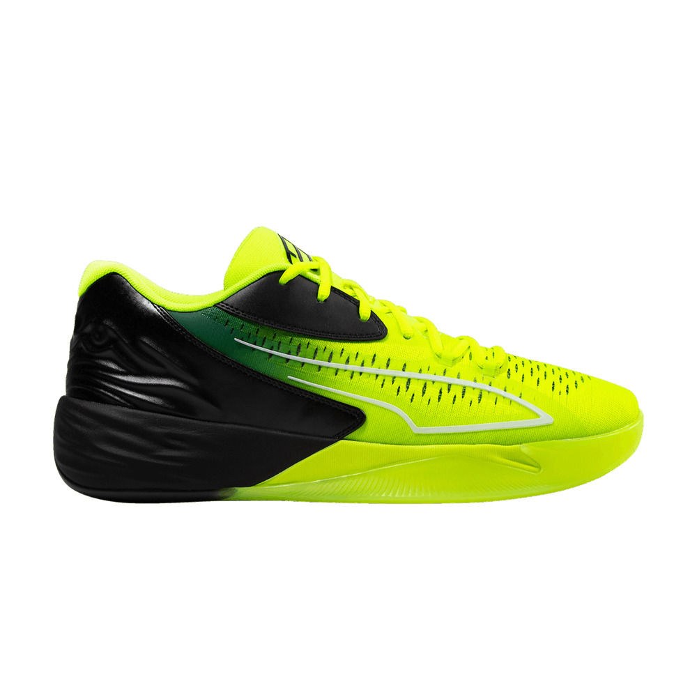 The PUMA Stewie 1 ‘Quiet Fire’ debuts the inaugural signature shoe of WNBA star Breanna Stewart. The low-top dons a neon yellow mesh upper that transitions to a dark green hue along the collar. PUMA’s signature Formstrip is outlined in white on the lateral side, while Breanna Stewart’s personal logo graces the tongue. Molded flames on the contrasting black heel counter transition to rippled-water lines on the NITRO Foam midsole, which repeats the paneled theme of the upper. The rubber outsole extends up the heel, where it displays a suture graphic that references the athlete’s two Achilles surgeries. UPPER MATERIAL Mesh