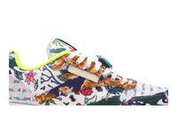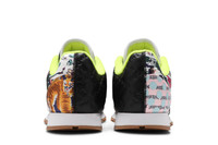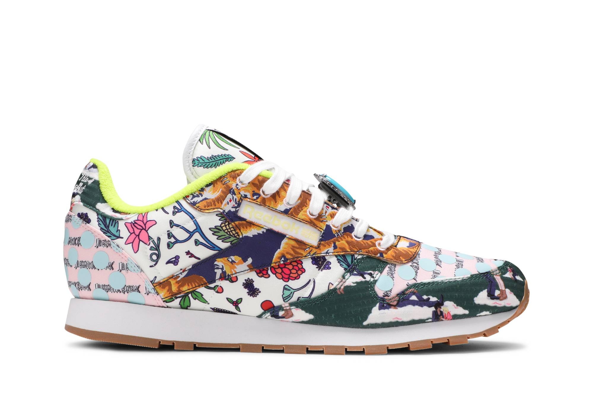Drawn from a capsule collection inspired by the iconic 1993 film, the Jurassic Park x Reebok Classic Leather ‘Ian Malcolm’ pays tribute to Jeff Goldblum’s mathematician character, whose embrace of chaos theory is reflected in the shoe’s design. The medial side of the upper is constructed from monochromatic black leather, while the opposite side features layered textile in a jumbled mix of colorful floral prints. A turquoise lace jewel gives the nod to Malcolm’s personal aesthetic. The retro silhouette is mounted on a lightweight EVA midsole, supported underfoot by a grippy gum rubber outsole. UPPER MATERIAL Leather