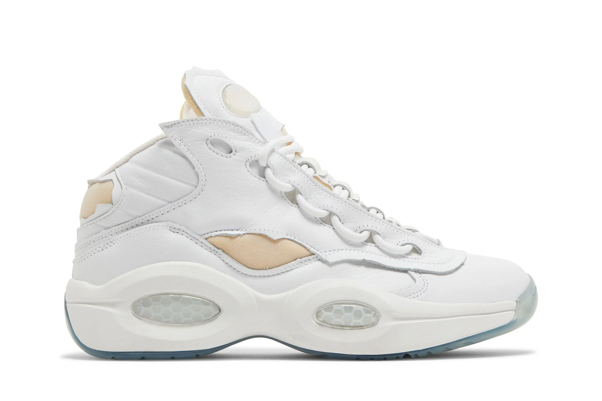 The Maison Margiela x Reebok Question Mid ‘Memory Of’ transforms Allen Iverson’s debut signature shoe with a deconstructed build. Inspired by the French luxury brand’s ‘Memory Of’ concept, the retro silhouette features a white leather upper stripped of signature branding elements at the heel tab and quarter panel. Left in their wake are tattered edges and exposed foam underlays. The sneaker rides on a matching white EVA midsole, fitted with visible Hexalite cushioning and supported by a blue-tinged translucent rubber outsole. UPPER MATERIAL Leather