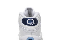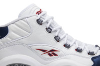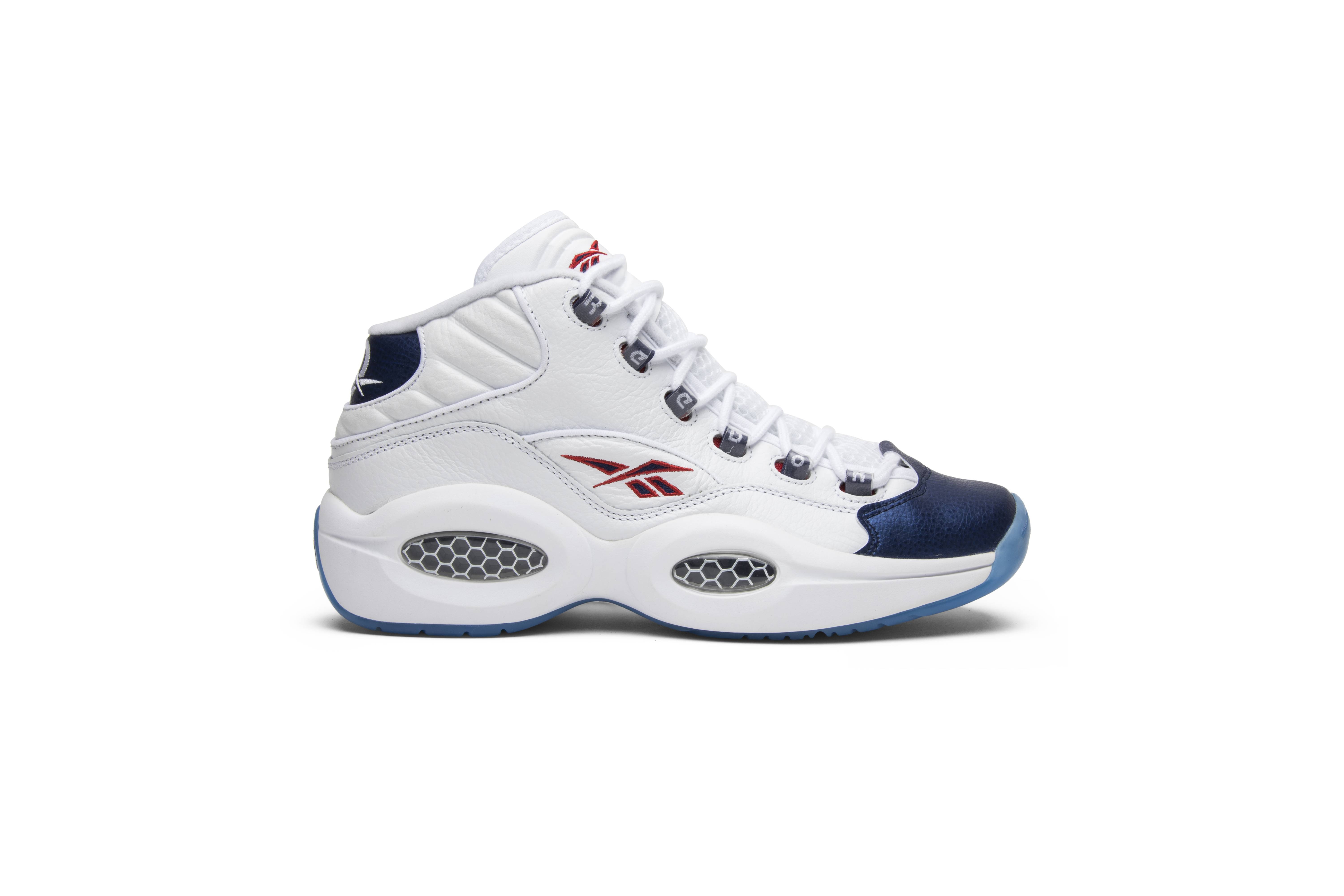 This December 2016 Reebok Question Mid 'Blue Toe' was the first re-release for the OG ‘Blue Toe’ colorway. Faithful to the original, it features a Philadelphia 76ers-inspired white leather upper with a pearlized navy blue toe and heel. It also comes with red Reebok branding on the side panels and tongue and an icy blue translucent outsole. Worn in his rookie-of-the-year 1996-97 season in the NBA with the 76ers, Iverson rocked the ‘Blue Toe’ for his now legendary stepover against the G.O.A.T. himself.
