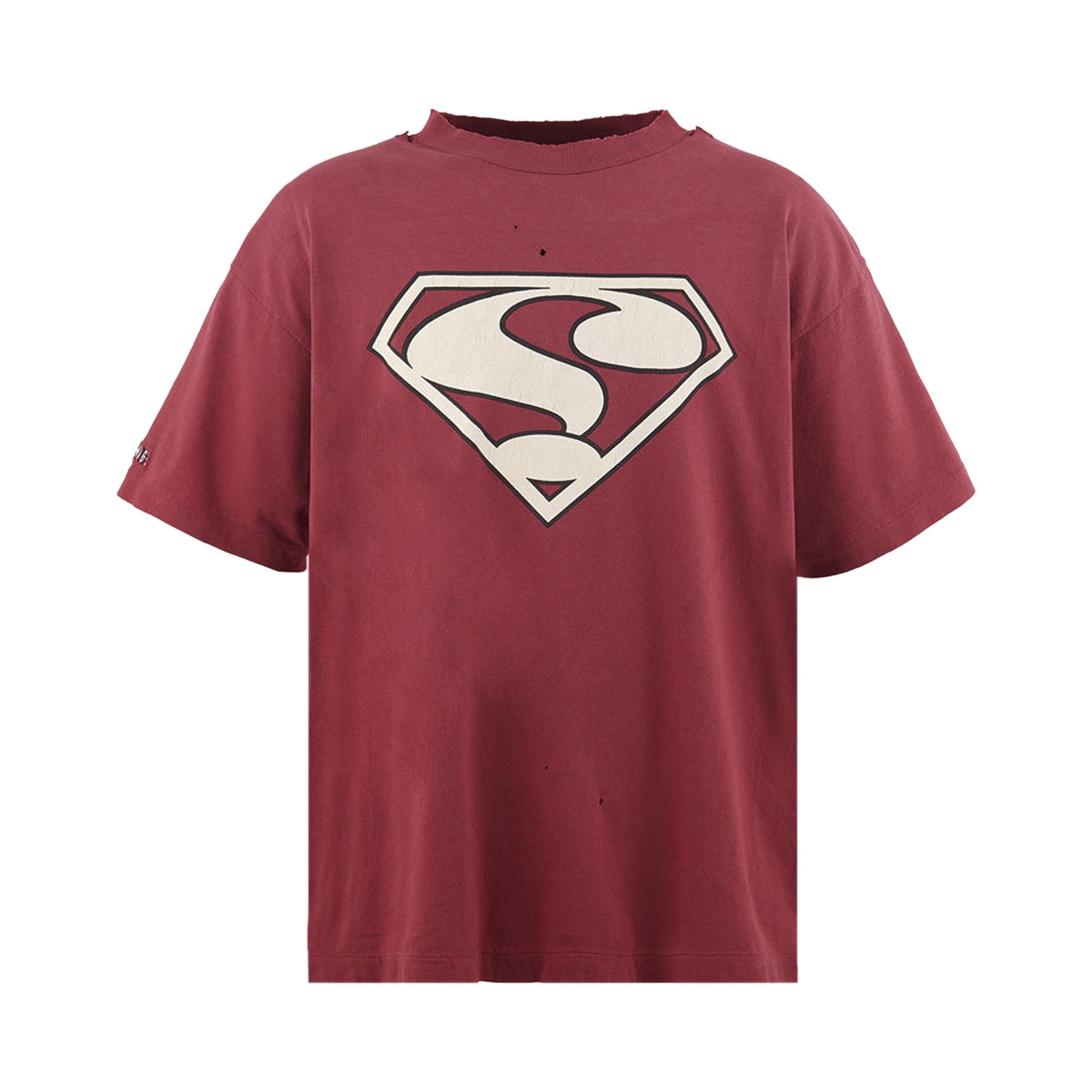 Saint Superman Distressed Paint-Splattered Printed Cotton-Jersey T-Shirt Burgundy