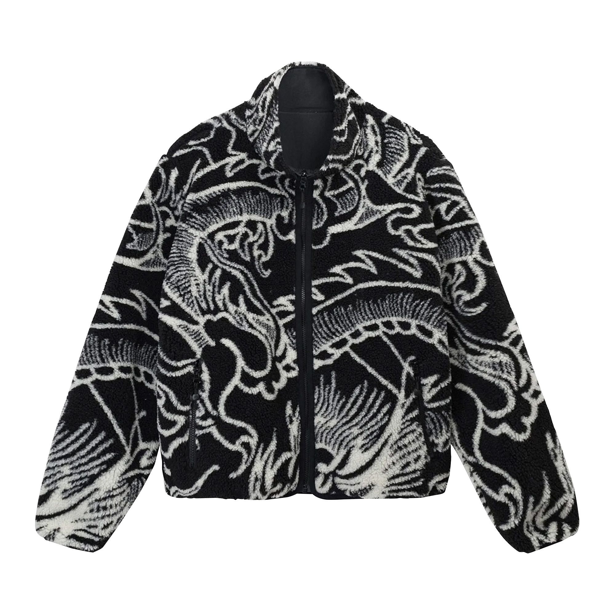 This Stussy jacket is crafted from soft sherpa, with a dragon motif woven throughout. Made for the California brand's SS22 collection, the zip-front layering piece is rendered in black for a versatile aesthetic.
