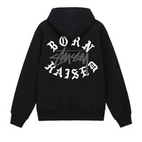 Stussy made this hoodie in collaboration with LA-based brand Born x Raised for SS23. Printed with dual branding on the chest and back, the black sweatshirt features a zip closure down the front.