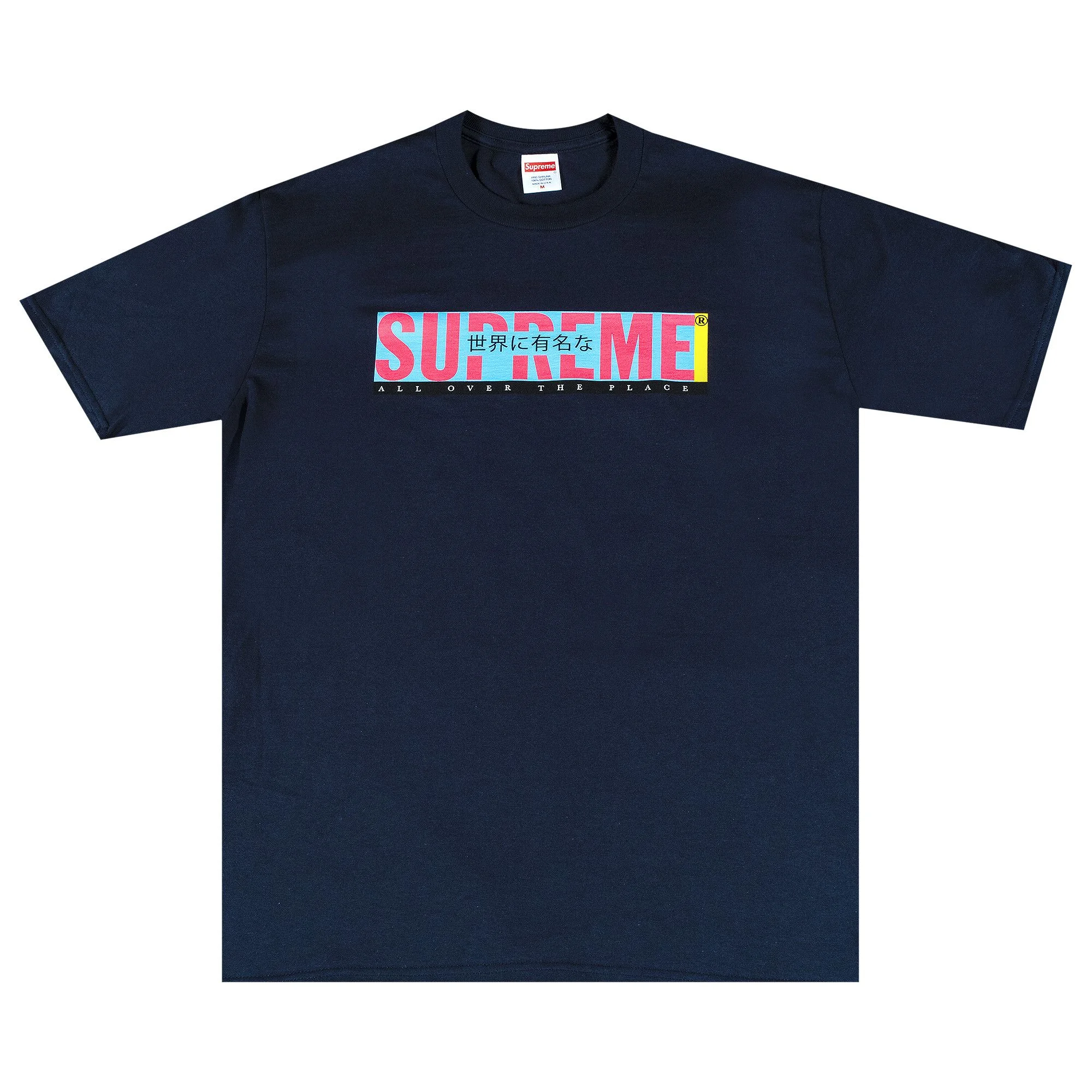 This Supreme T-shirt is printed with "All Over The Place" text and Japanese kanji characters over the brand's logo. Made for the skate brand's SS22 collection, the short-sleeve tee is rendered in navy and finished with a crewneck.