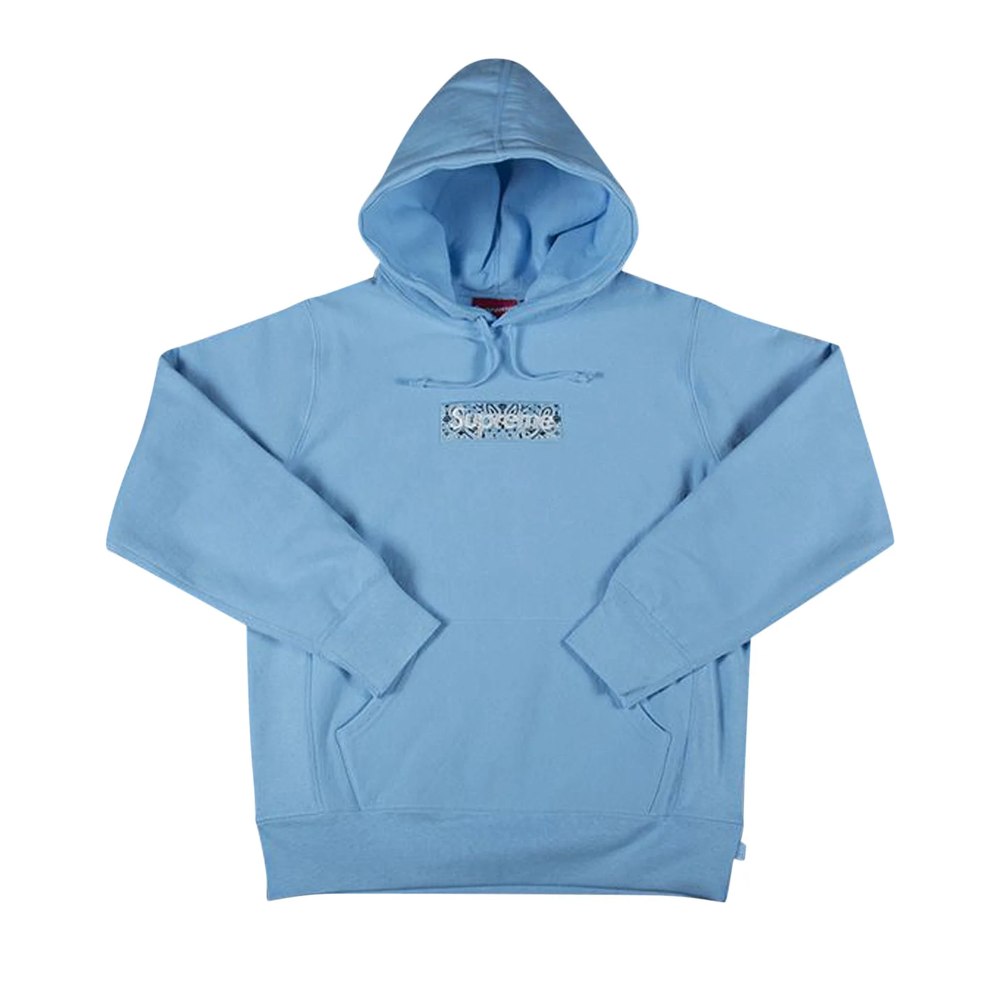 This Supreme Bandana Box Logo Hooded Sweatshirt from FW19 features a logo embroidery with a paisley-printed background. The seasonal style is rendered in light blue and includes an adjustable hood.