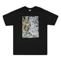 This Supreme Bling Tee is printed with graphics of jewelry, gold and cash. Made for the SS20 season, the black T-shirt is topped with a crewneck. The brand's logo is integrated within the artwork.