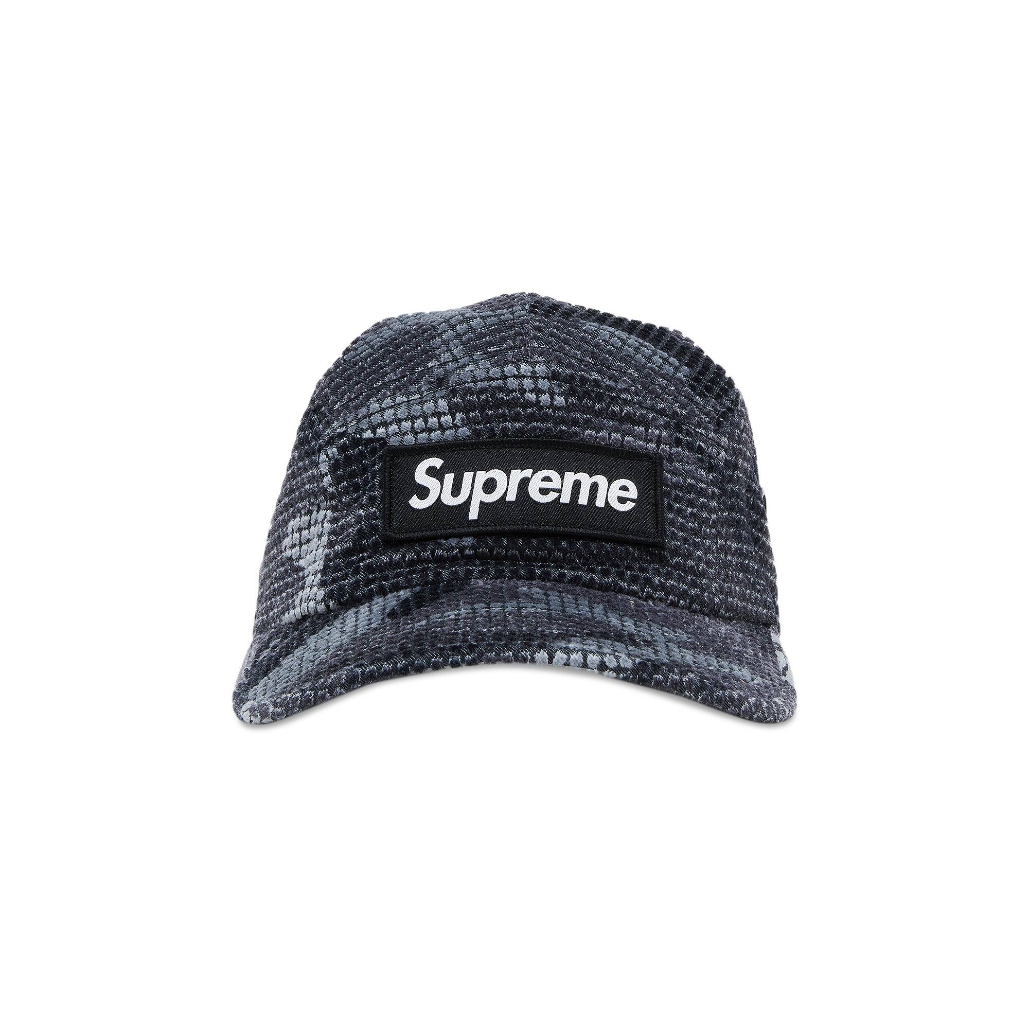 This Supreme camp cap is cut from cotton-blend velvet with an embossed grid pattern. From the FW22 season, the hat is executed with a black camouflage print.