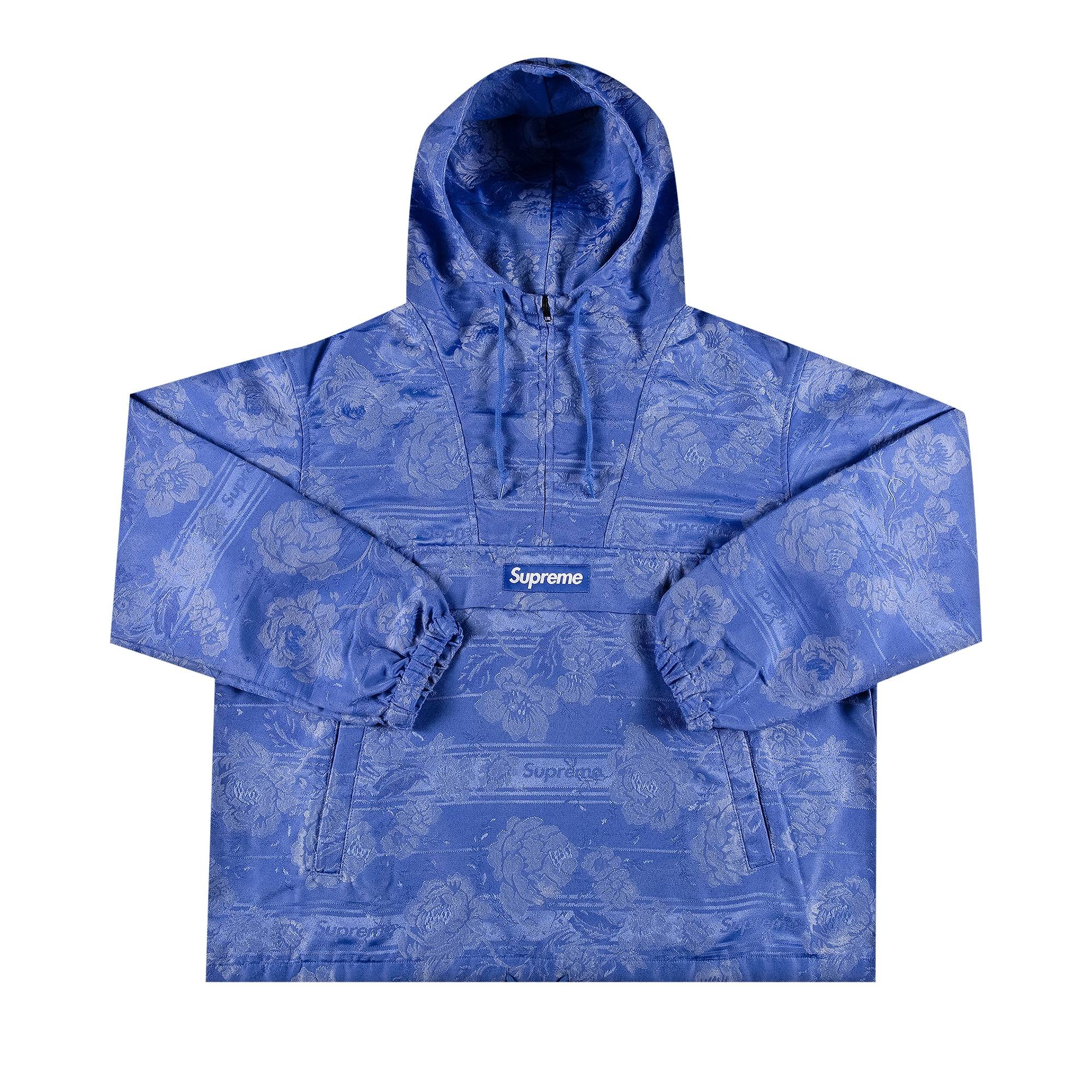 This blue Supreme anorak is detailed with an all-over floral tapestry motif, featuring the brand's logo integrated throughout the print. Supreme's box logo appears on the front of the design. Made for the label's SS21 collection, the long-sleeve pullover includes a quarter-zip closure and is topped with a hood.