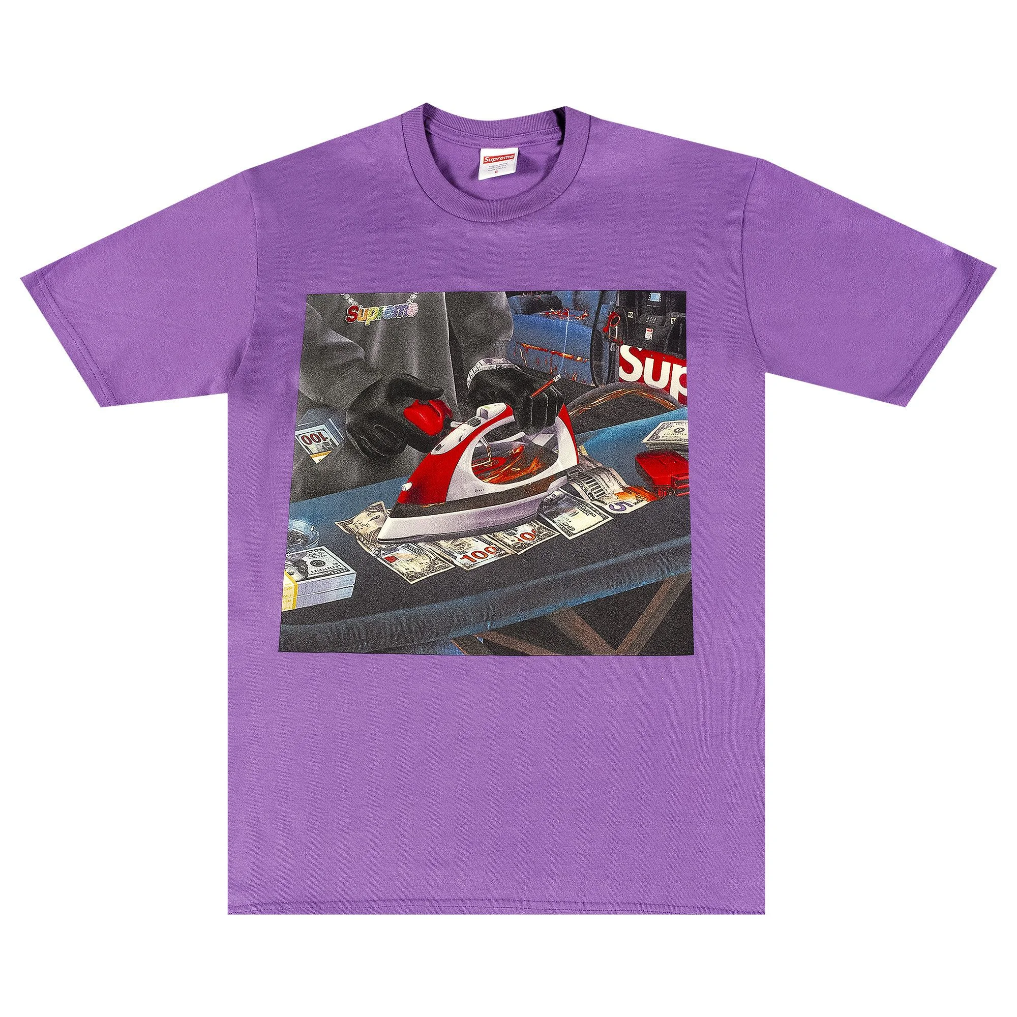 The printed artwork on Supreme's Gas Tee depicts a figure wearing one of the brand's hoodies and pouring gasoline onto an iron set atop cash. From SS22, the cotton T-shirt is designed in purple and topped with a crewneck. The back features the words "Always Open" on top of a small box logo.