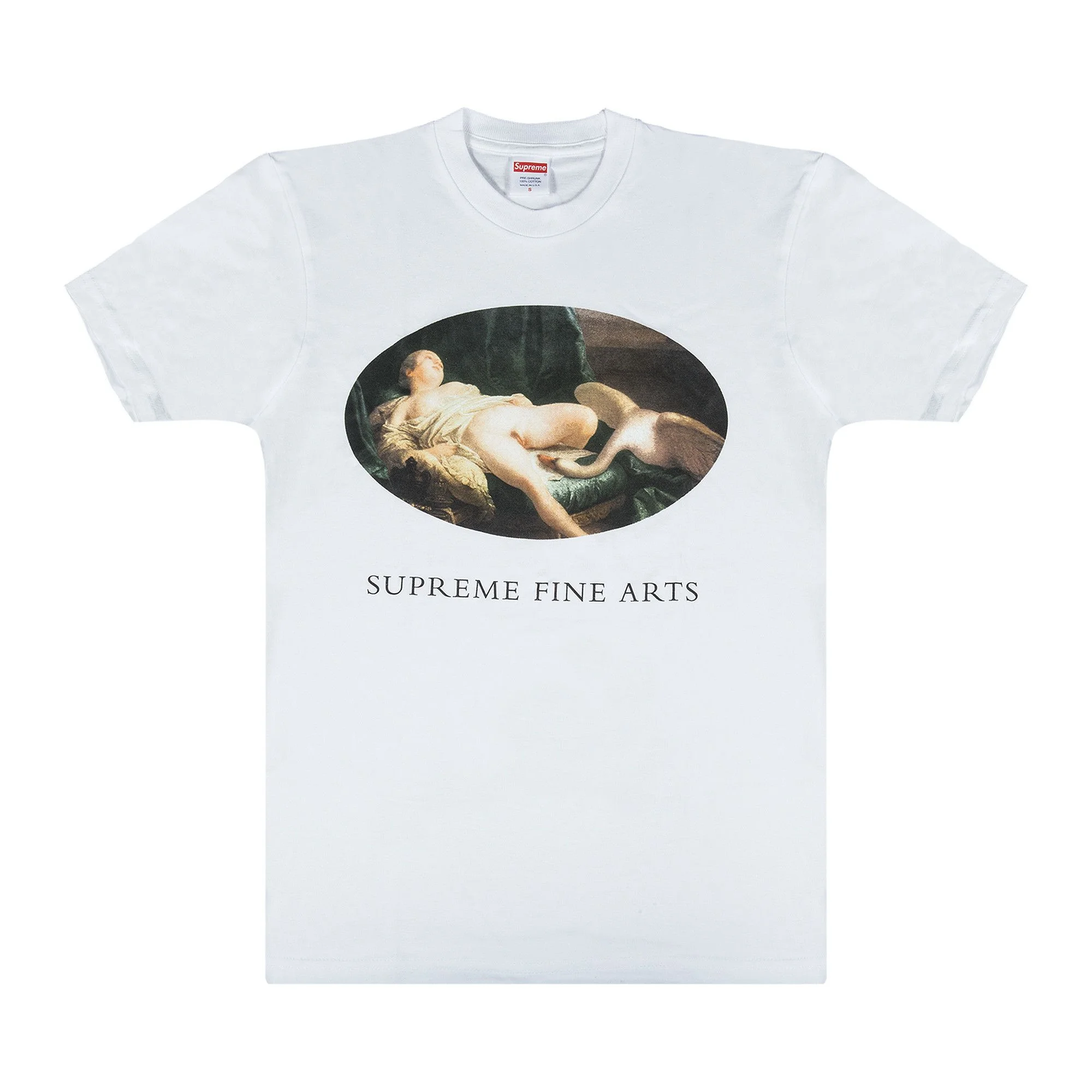 Supreme's Leda And The Swan T-Shirt from SS19 is printed with renaissance-style artwork depicting the Greek myth. The piece is crafted from soft white cotton and finished with 'Supreme Fine Arts' text.