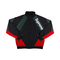 This Supreme track jacket is designed with red and green color blocked panels over a black base. Released as part of the skate brand's SS20 collection, the zip-front layering piece features a logo print on the front.
