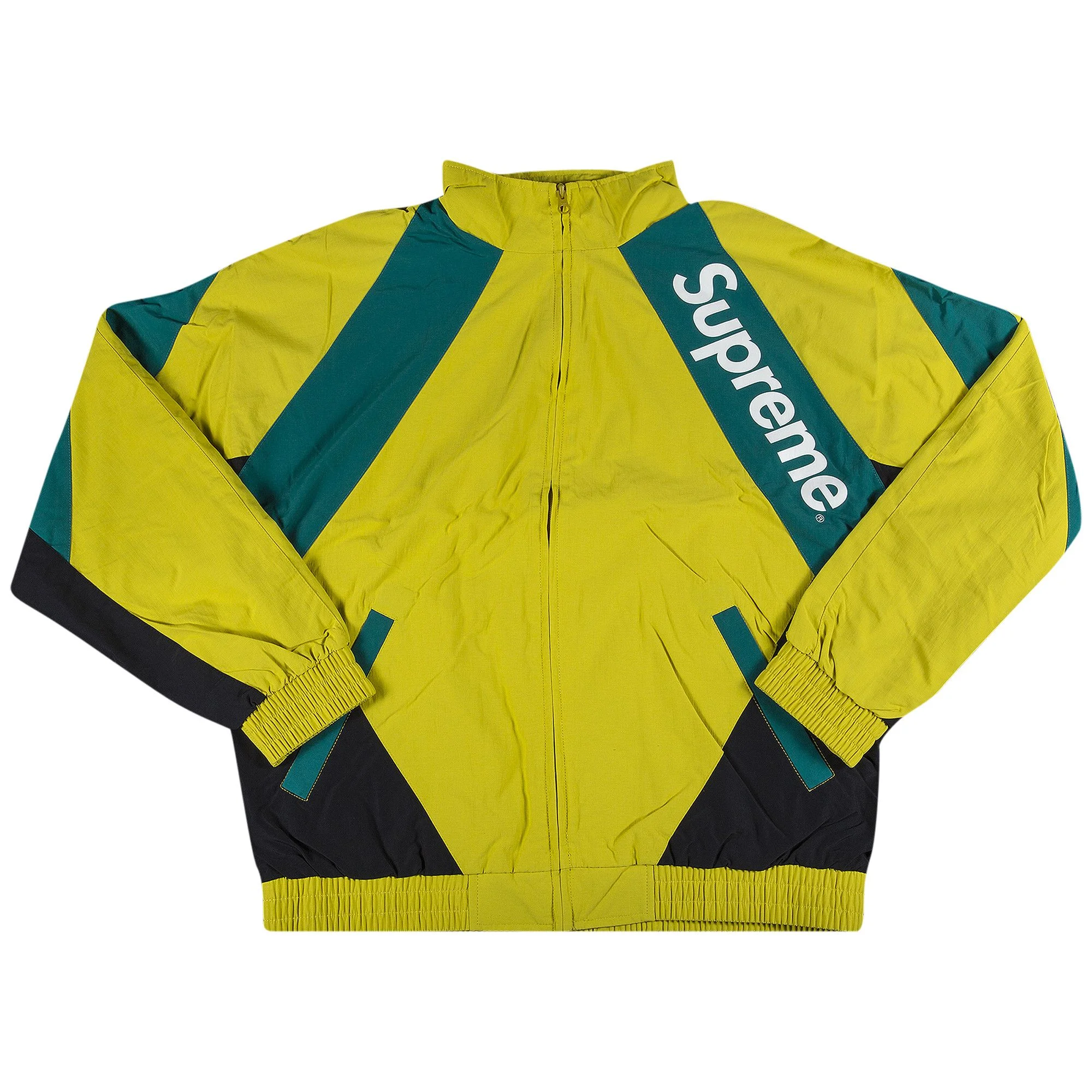 Supreme's Paneled Track Jacket was made for the SS20 collection. Crafted from water-resistant nylon in a lime green colorway, the zip-front layering piece is detailed with dark green and black color block panels alongside a logo print on the chest.