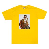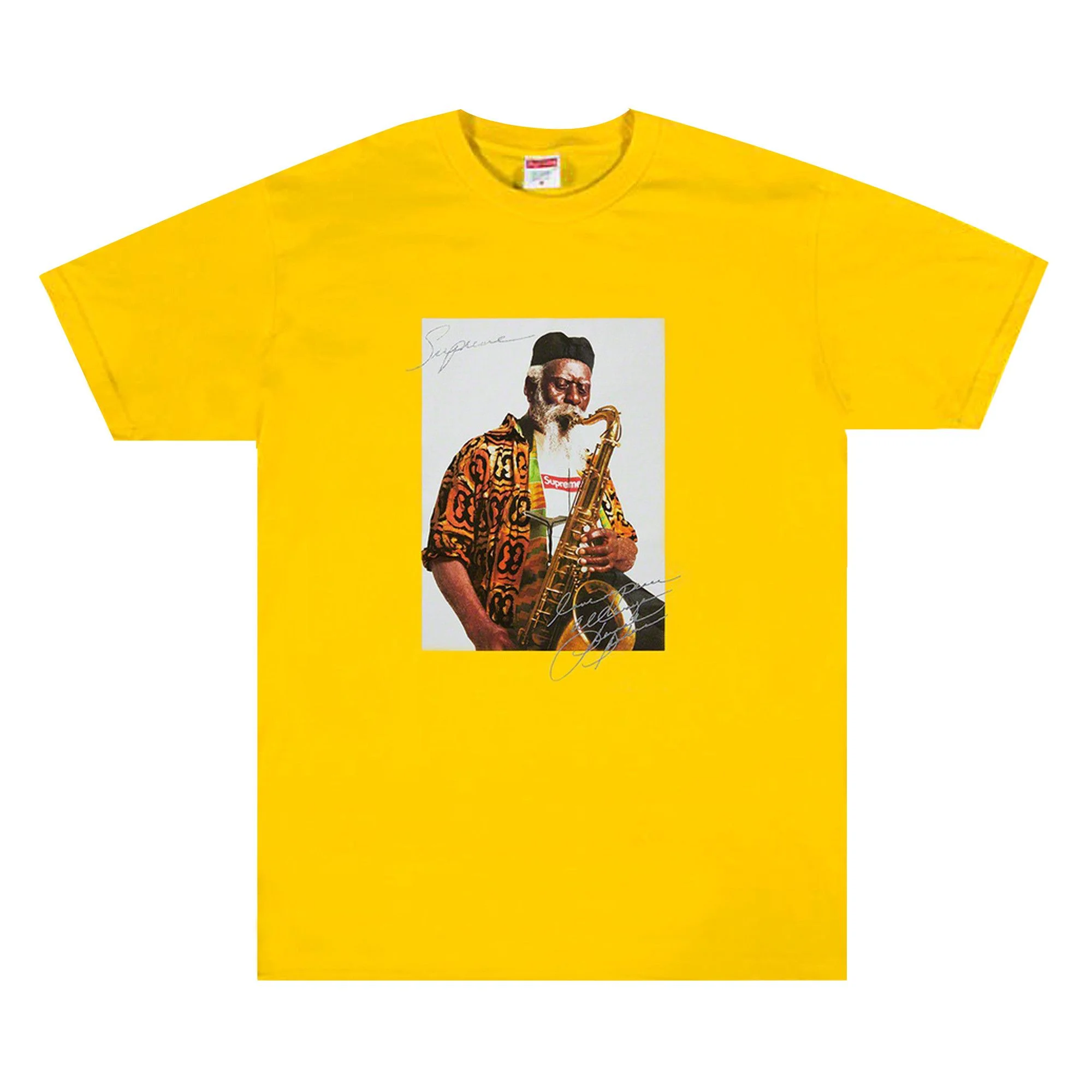 This Supreme T-shirt features printed graphics of jazz saxophonist Pharoah Sanders wearing one of the NYC skate brand's iconic box logo tees. Made for the FW20 season, the crewneck top is cut from yellow cotton jersey.