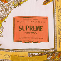 This Supreme cardigan from the FW23 season is designed with printed silk panels set against wool in a warm yellow colorway. The graphics depict a map of New York City and feature a logo print made to look like the title of the map.