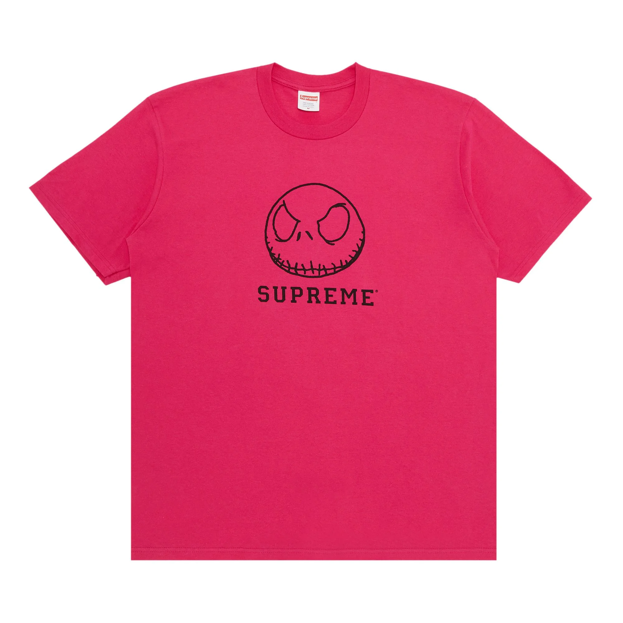 This Supreme Skeleton Tee is printed with graphics depicting the Jack Skellington character from Tim Burton's 'The Nightmare Before Christmas.' Made for the brand's FW23 collection, the short-sleeve shirt is rendered in pink and features the brand's logo below the artwork.