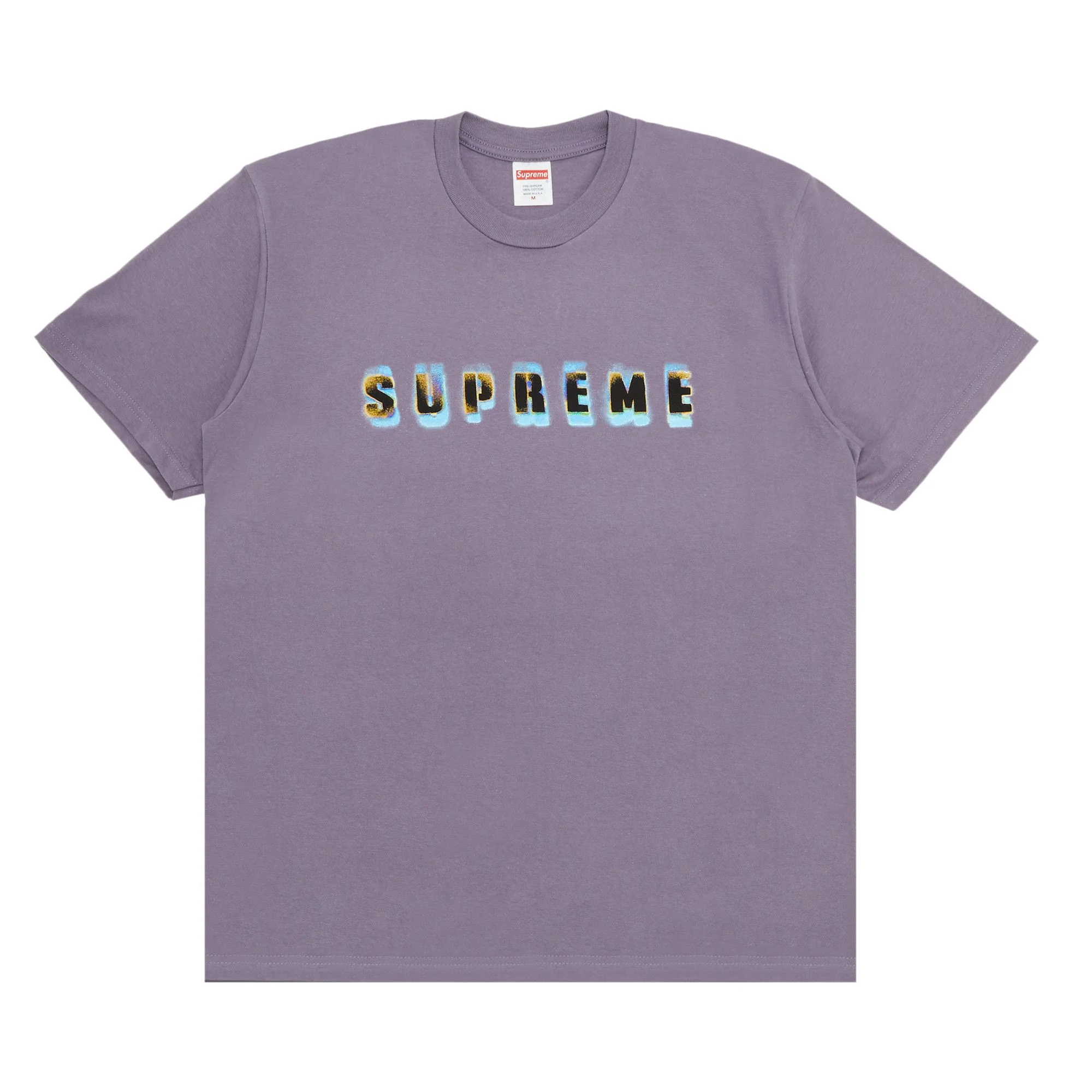 The logo on this Supreme T-shirt is designed to appear as though it has been spray-painted on with stencils. From the brand's FW23 collection, the short-sleeve tee is finished in a soft purple colorway with black, yellow and blue lettering.