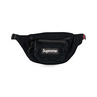 Supreme's String Waist Bag is designed in black with a rib-like texture throughout. Made for the SS21 season, the accessory features two zip pockets and a logo patch on the front.