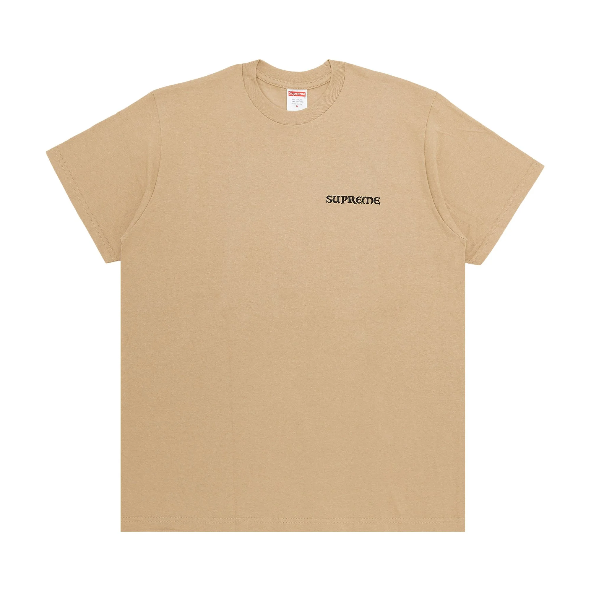 This Supreme Worship Tee features graphics resembling stained glass artwork typically seen in houses of worship. From the brand's FW23 collection, the short-sleeve top is rendered in beige and printed with a logo on the chest.