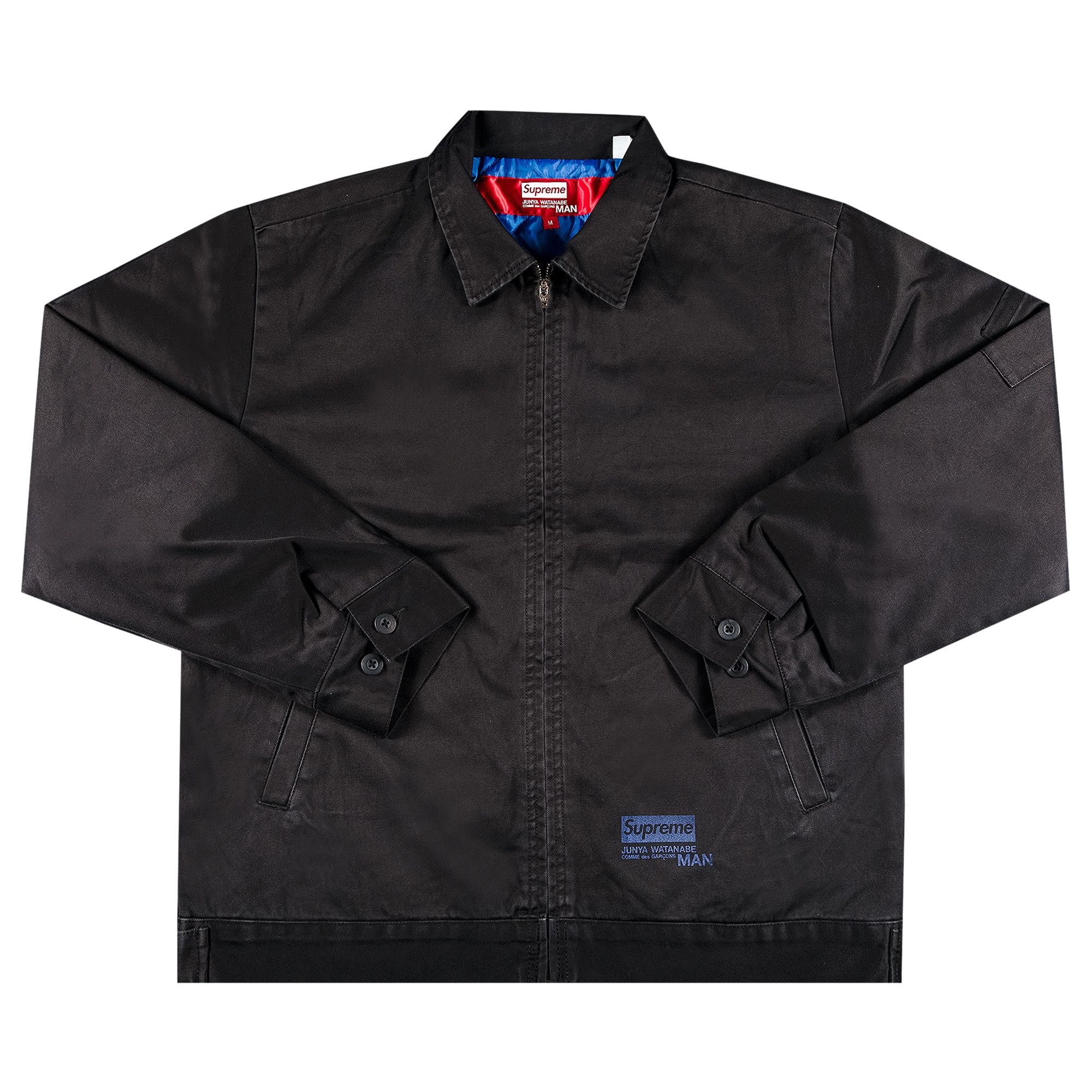 Supreme worked with Junya Watanabe and Comme des Garcons MAN on this work jacket during the FW21 season. The black layering piece is cut from cotton chino twill and features blue text detailing on the front and back.