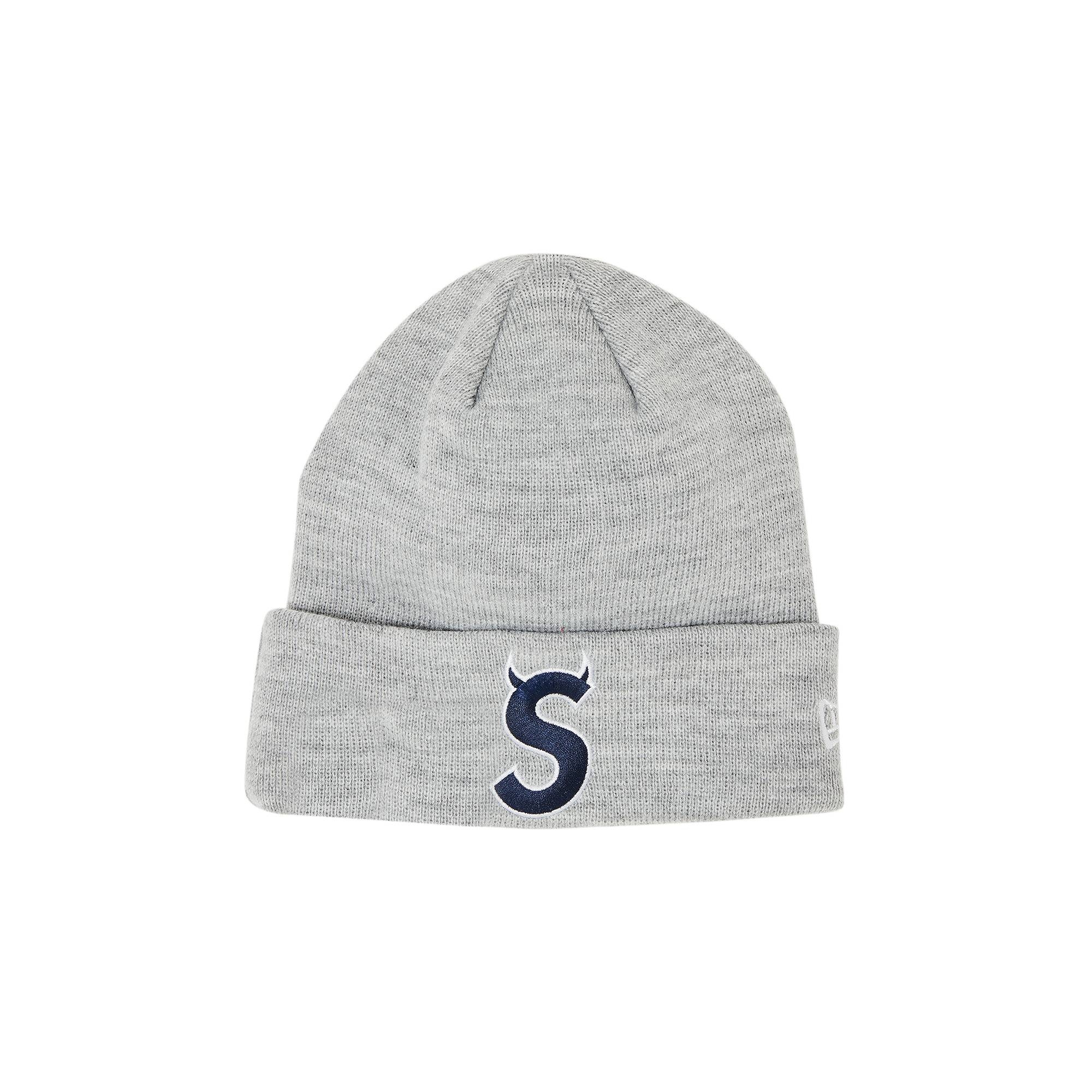 This Supreme x New Era beanie is detailed with a horned "S" logo embroidery on the front. From the FW22 season, the hat is knitted in grey and features additional branding on the side and back.