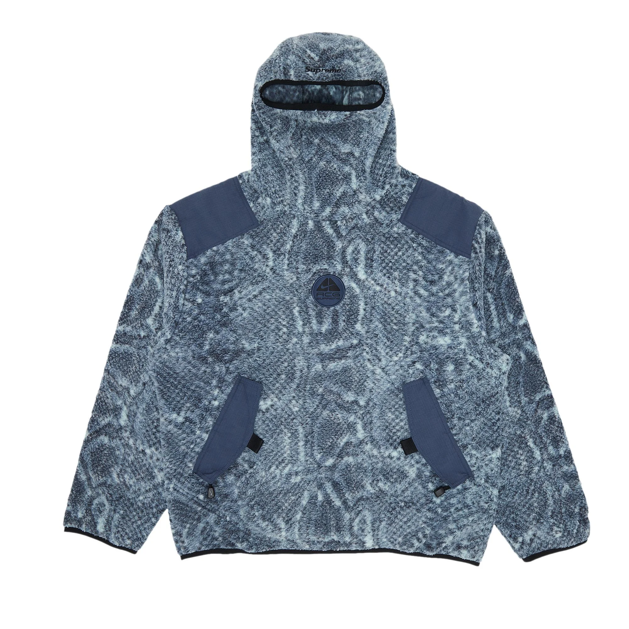 Made in collaboration with Nike's All Conditions Gear line, this Supreme pullover from FW22 is designed for outdoor wear. The layer is made from mint snakekin-printed fleece and features embroidered logo patches from each brand.