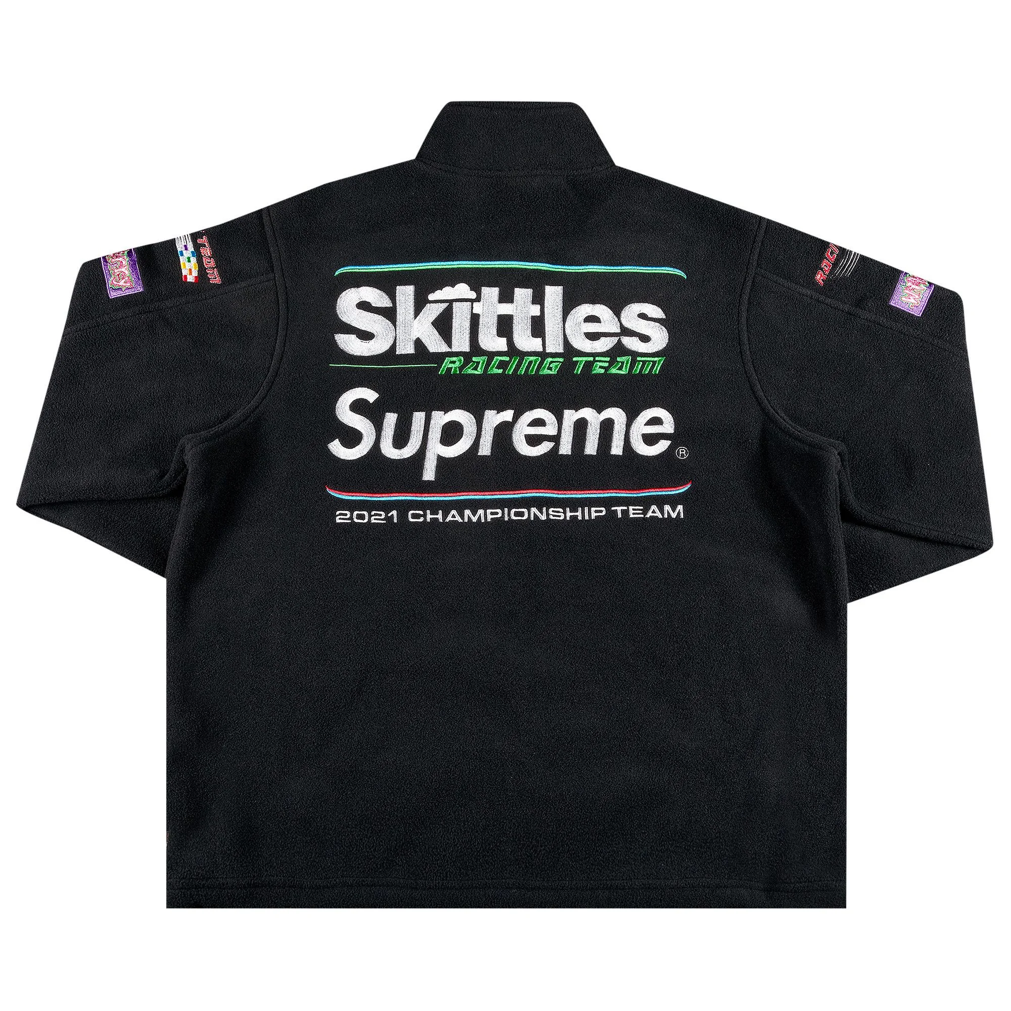Created in collaboration with Skittles, this Supreme Polartec Jacket from FW21 features graphics inspired by the world of racing. It's rendered in black and detailed with branded embroideries and "2021 Championship Team" text.