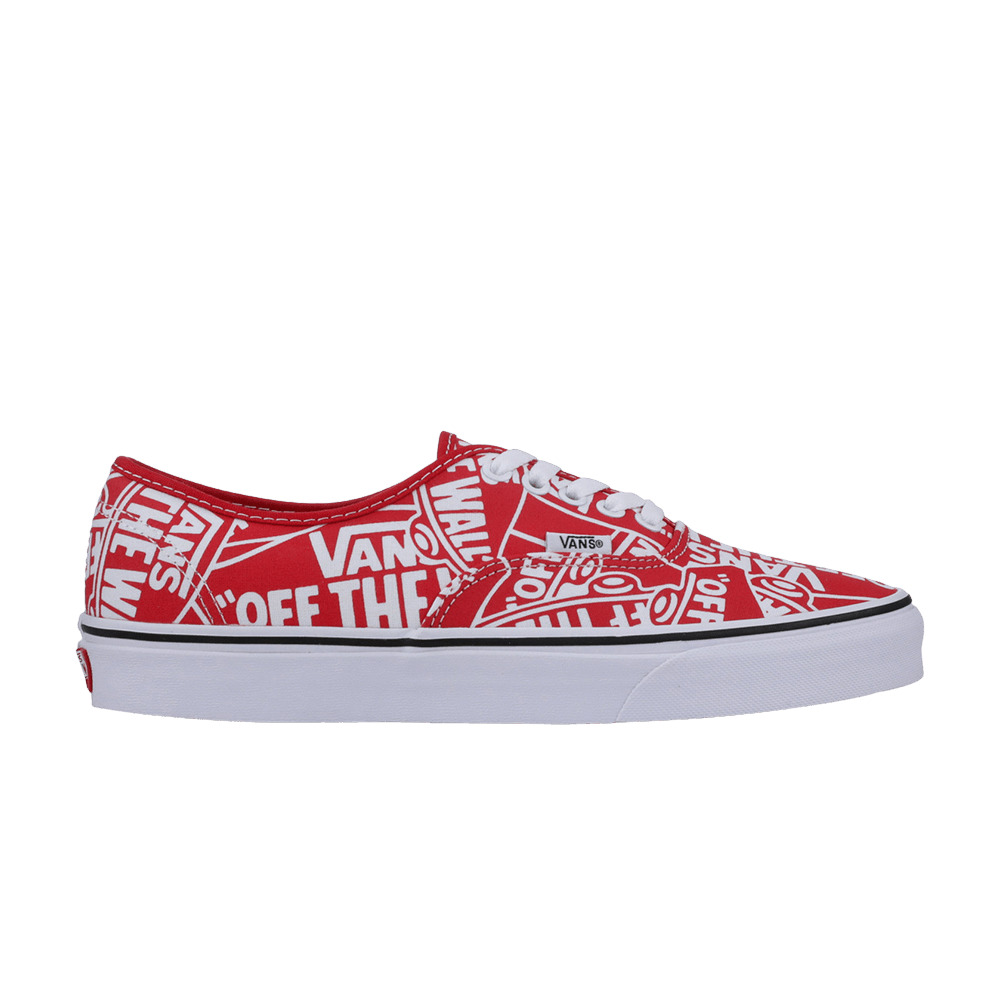 Originally debuted in 1966, the Vans Authentic was among the first to showcase the brand's red bumper logo in 1976. In this April 2018 'OTW Repeat' sneaker, the 'Off the Wall' logo is replicated across the canvas upper in white and red to a hyper-branded effect. The shoe's traditional low profile, metal eyelets and stitched panels are reprised, followed by a vulcanized sole with Waffle-inspired tread for boardfeel and traction.