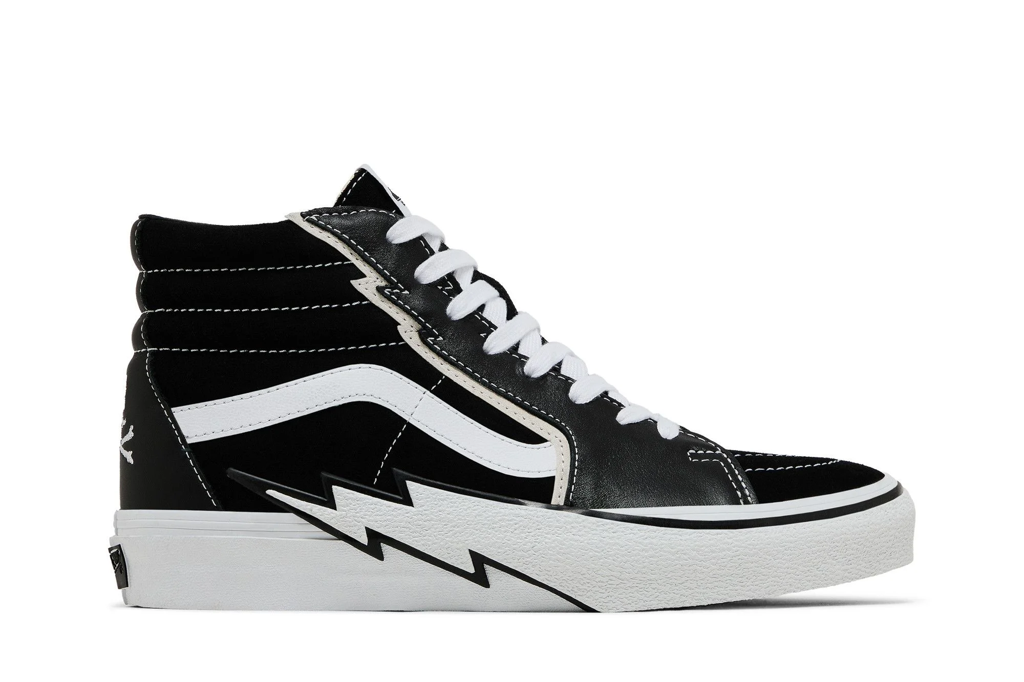 Dropping as part of a capsule collection featuring premium materials and an essential black and white palette, the Mastermind World x Vans Sk8-Hi VLT LX Bolt ‘Punk Culture’ delivers a stylized take on the classic silhouette. Built with black Italian leather and soft suede, the upper is accented with contrast stitching, a white leather side stripe, and unique thunderbolt detailing along the eyestay. A woven Vans Vault tag embellishes the tongue, while Mastermind World’s skull and crossbones logo graces the back heel. The high-top rides on a thunderbolt-adorned white rubber midsole, supported by a translucent waffle-traction outsole that reveals a custom checkerboard print. UPPER MATERIAL Leather