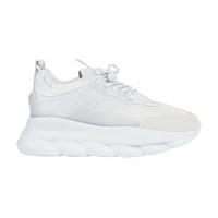 The Versace Wmns Chain Reaction sneaker balances the Italian house's singular iconography and modern style. Clad in white honeycomb mesh, this white women's version is enriched by a semi-transparent Greca cage, suede toe cap and stitched leather panels. Dipped laces and a rubber tongue badge inspire a technical aesthetic while a Greek key pattern on the vamp points to heritage. Its matching rubber sole carries the defining chain link tread.
