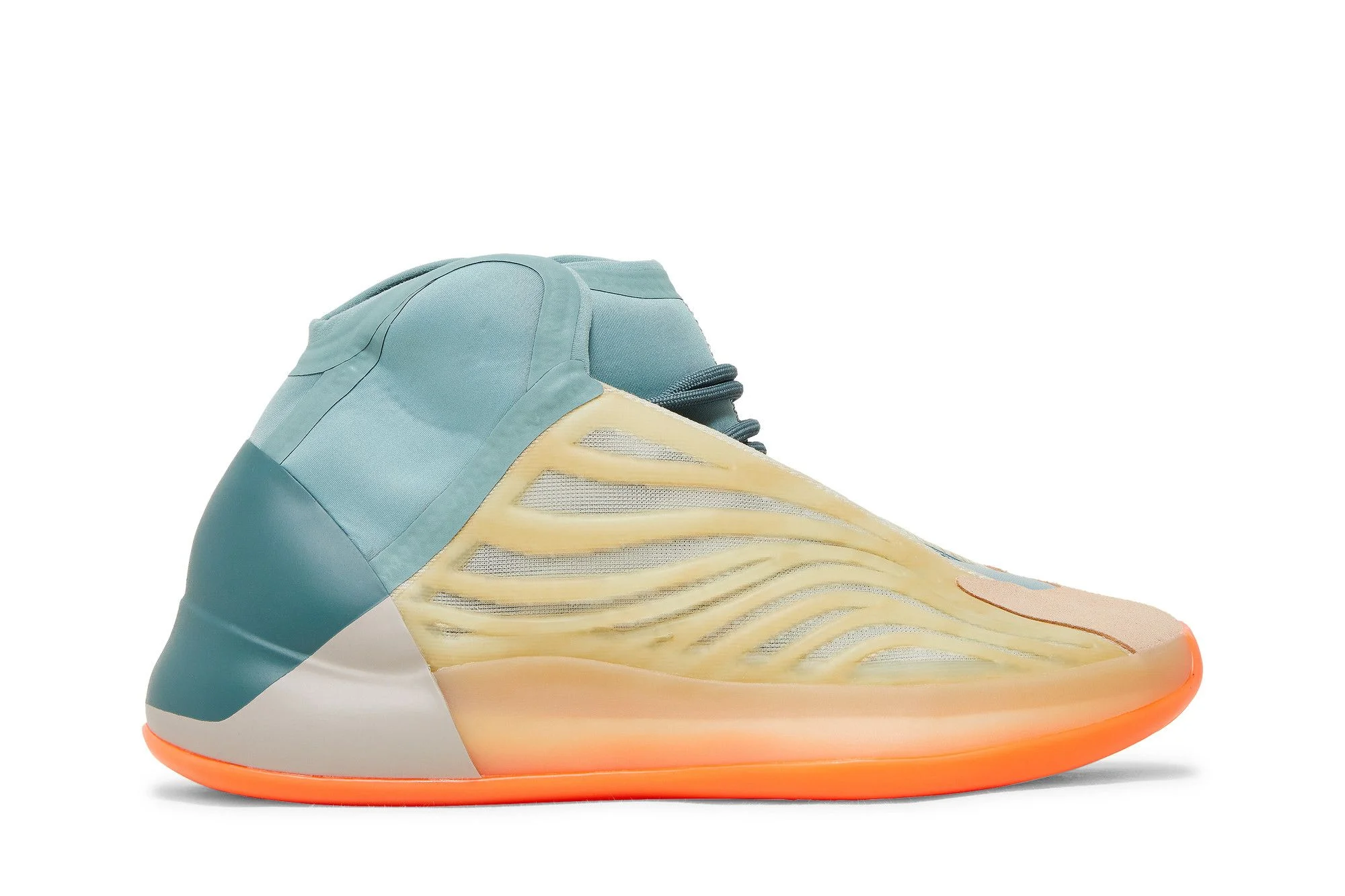 The adidas Yeezy Quantum ‘Hi-Res Coral’ enlivens the basketball-inspired lifestyle silhouette with an energetic color palette. The shoe’s unique design is distinguished by the flowing lines of the yellow RPU cage, overlaid atop an upper built with semi-translucent jacquard mesh. Beige synthetic suede reinforces the toe, while the collar and heel feature stretchy neoprene construction in a subtle sage green hue. The sneaker rides on a full-length Boost midsole, enveloped in an orange TPU cage and supported by a color-matched rubber outsole. UPPER MATERIAL Primeknit