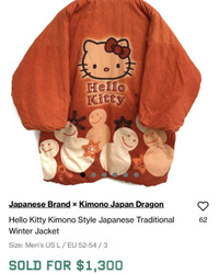 Rare Design Vintage 80s Kimono Japan Hello Kitty If You Like This Pieces, Please Buy Immediately. It May Not Easy To Find It Again. こんにちは、オンラインショップへようこそ Please Buy With Confidence. We Had More Than 333 Sold Items At Grailed With Perfect Feedback! Brand : Sanrio Hello Kitty Design : Kimono, Yukata, Japan Made In : Japan Colour : Blue Condition : 9/10 - Used Condition, Code : BJ01 Measurement Size : Lying Flat Chest 23 inches, Length 30 inches, Tag Size : M - L 【DISCOUNT】 Please Give Us Your Offer, We Can Only Accept The Discount By Negotiation 【PLEASE READ CAREFULLY OUR DESCRIPTION AND SATISFIED OUR ITEM BEFORE MAKE ANY PAYMENT】 *** Products maybe vintage or used item and may have sign of wear *** NO Return & NO Refund & NO Fussy Buyer *** Payment Accepted via PayPal Only *** Details at the photo for confirmation 【SHIPMENT】 All item/pieces will be shipped within 1-3 business day via DHL Express Post with tracking number (within 7-21 days). +++ Don't worry about customs tax or fee. We usually declare item as a 'gift & declare value of item below than original price +++ 【IMPORTANT】 TELEPHONE NUMBER and EMAIL is required for standard shipping detail