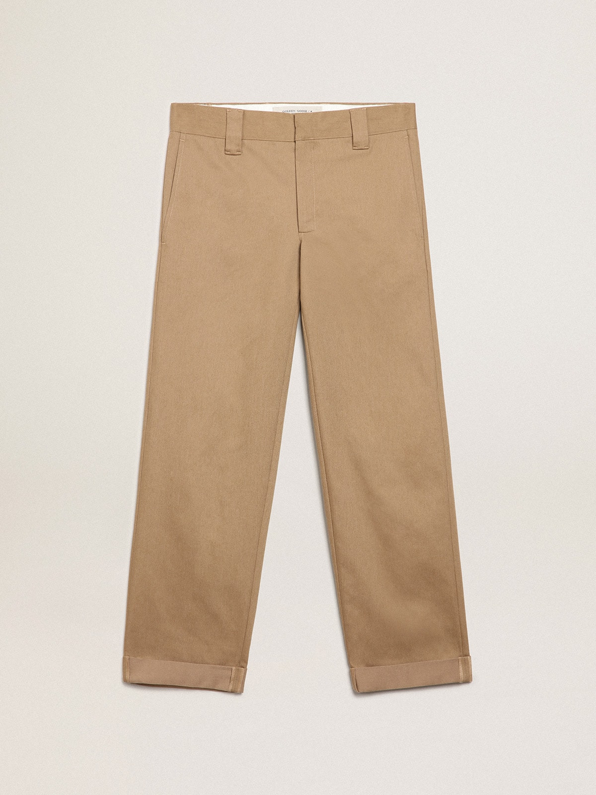A unique, timeless collection that encapsulates the Golden Goose DNA, designed to remain with you every day, through thick and thin, come rain or shine. These beige khaki chinos feature a straight leg and two front pockets. The detachable white patch with a finely embroidered letter G in red adds the finishing touch. DETAILS Item No. GMP01190.P000786.15369 - Color: beige khaki - Detachable white patch with embroidered red letter G - Double gold star on the back - Four pockets - Straight leg - Main material: 40% comfort gabardine, 40% cotton, 20% polyester The model is 183 cm tall and is wearing a size M.