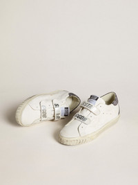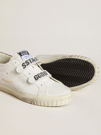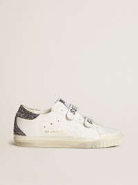 Our Old School sneakers feature two Velcro straps on the front with contrasting logo. This model, with a white bio-based upper, features a perforated star and an anthracite glitter heel tab. The anthracite glitter insert on the back adds the finishing touch. DETAILS Item No. GWF00847.F006692.11867 - Color: white - Perforated star - Anthracite glitter heel tab - Anthracite glitter insert on the back - Velcro fastening with contrasting logo - Vintage finish - Upper: 43% textile polyurethane, 30% cotton, 20% cellulose, 7% polyethylene terephthalate - Lining: 41% cotton, 41% textile polyurethane, 12% viscose, 6% polyester - Sole: 100% rubber - Handmade - Made in Italy
