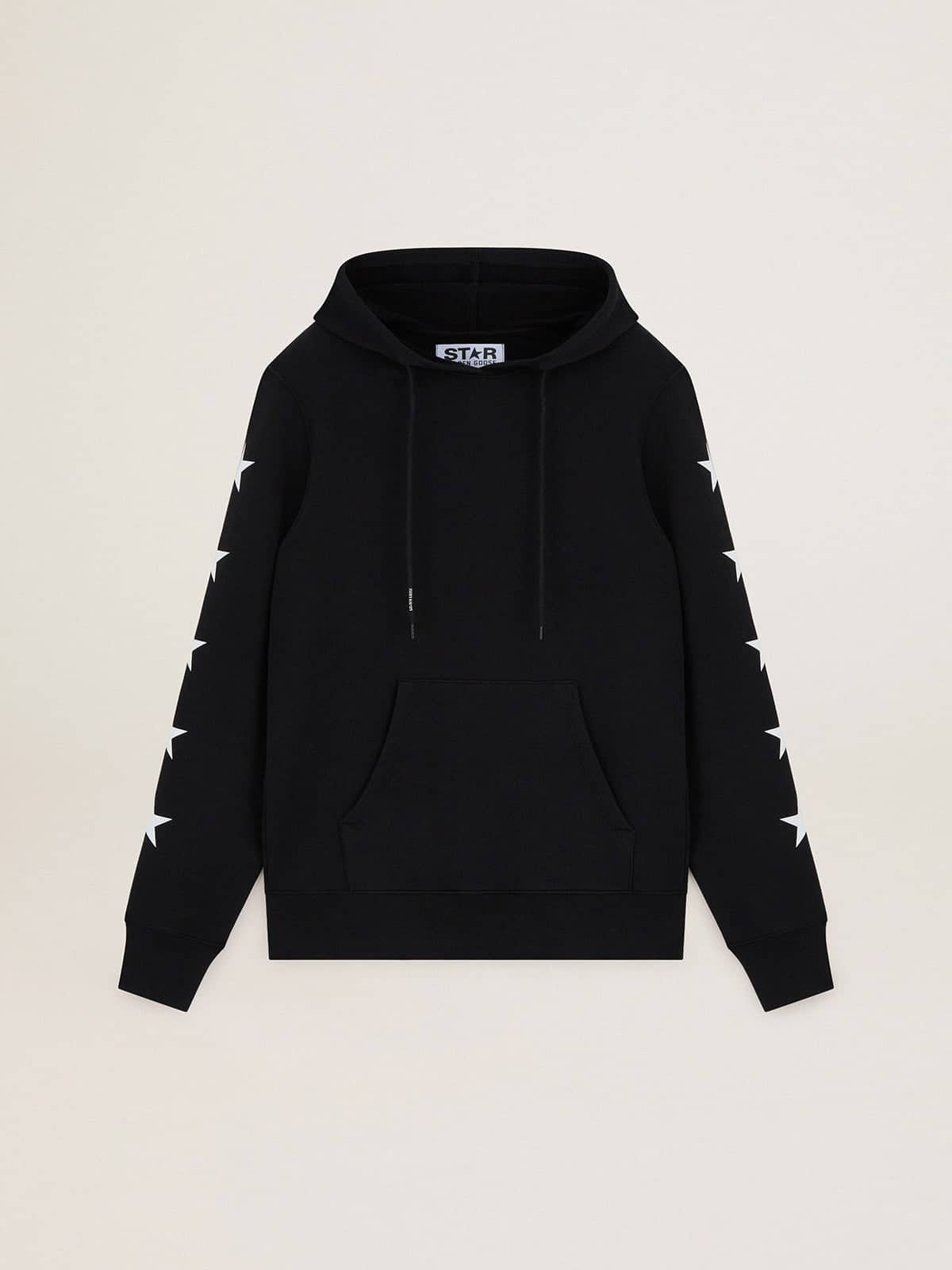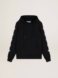 A collection with a casual soul but a versatile attitude: inspired by the Seventies, it has a timeless vintage appeal, suited to any occasion or look. This round-neck, regular-fit hooded sweatshirt in black pure cotton features stars on the sleeves and a maxi star on the back, both in white. A versatile garment for all your looks. DETAILS Item No. GMP01224.P000534.80203 - Color: black - Round neck - Contrasting white stars on the sleeves - White maxi star on the back - Long sleeves - Main material: 100% cotton - Rib material: 100% cotton - Made in Italy The model is 183 cm tall and is wearing a size M.